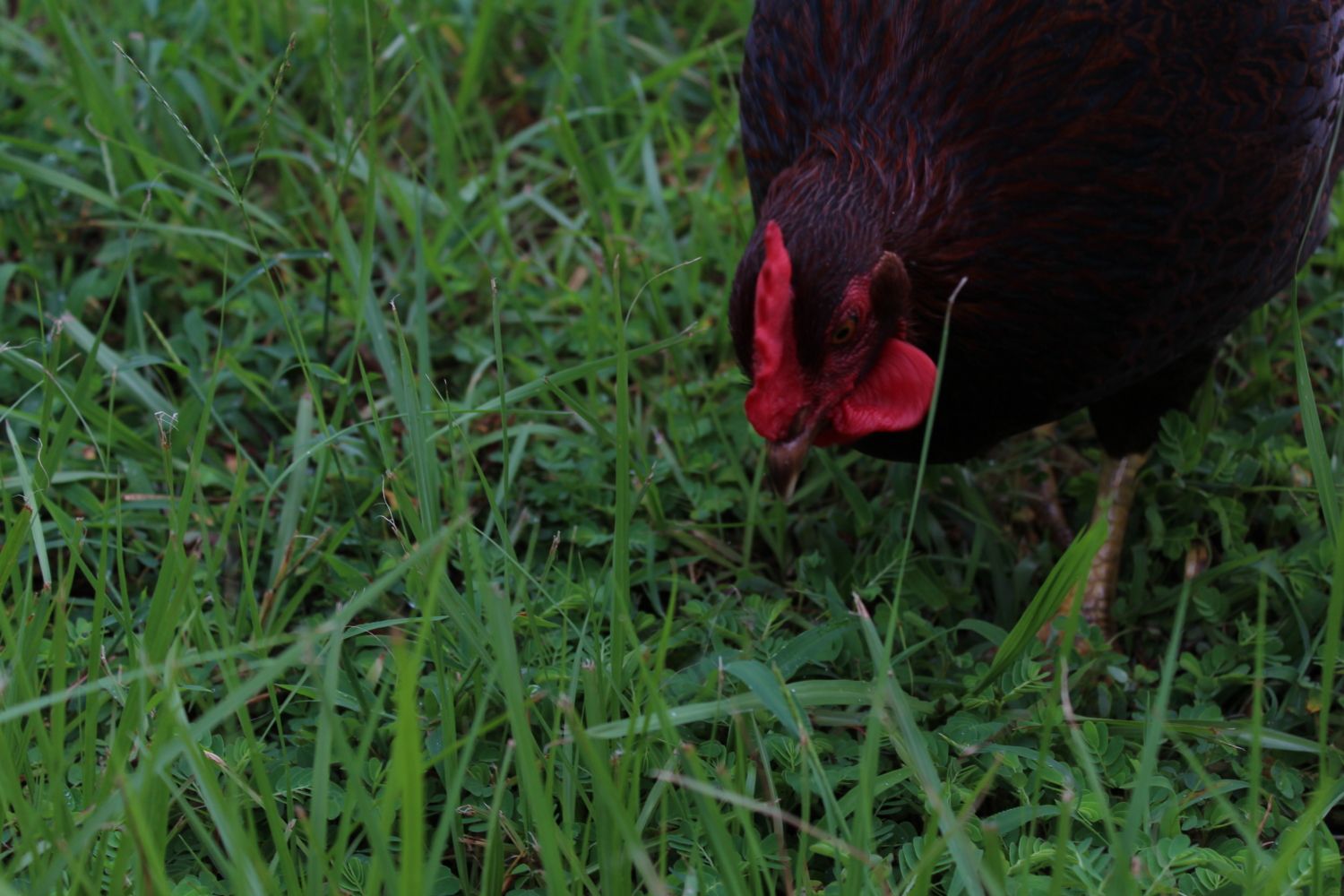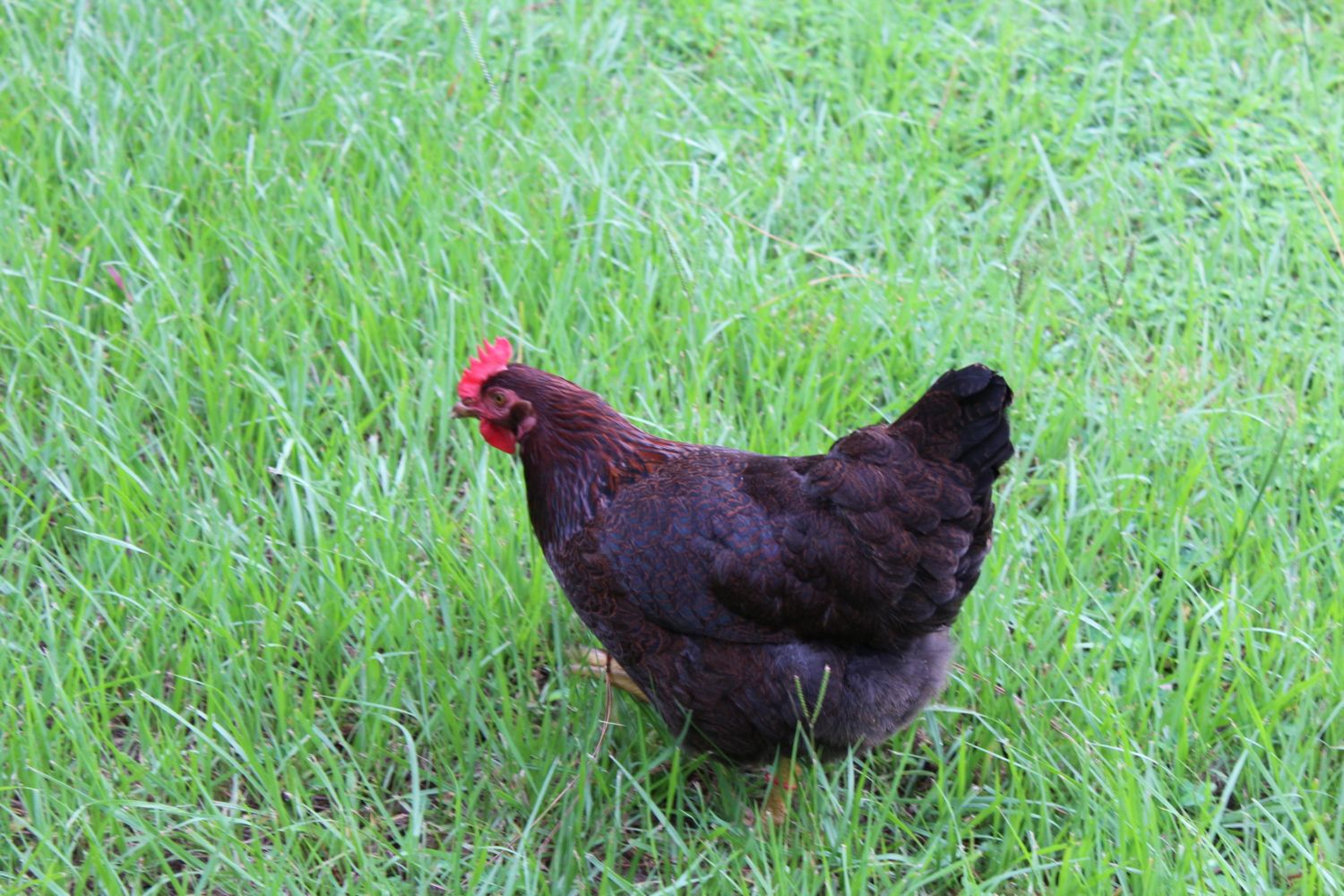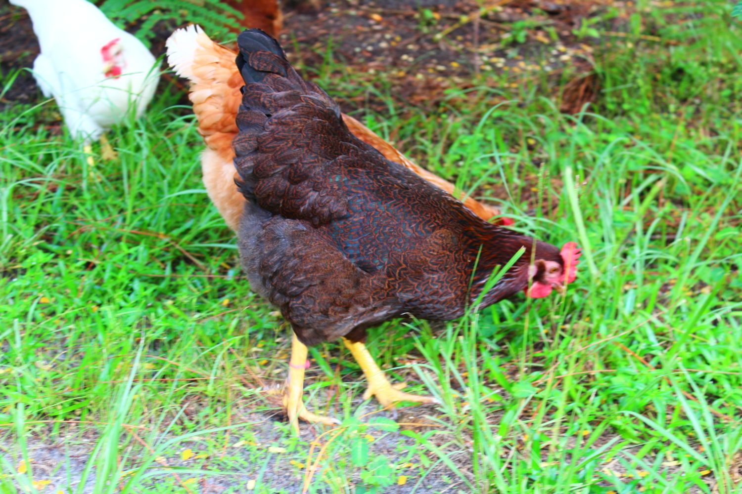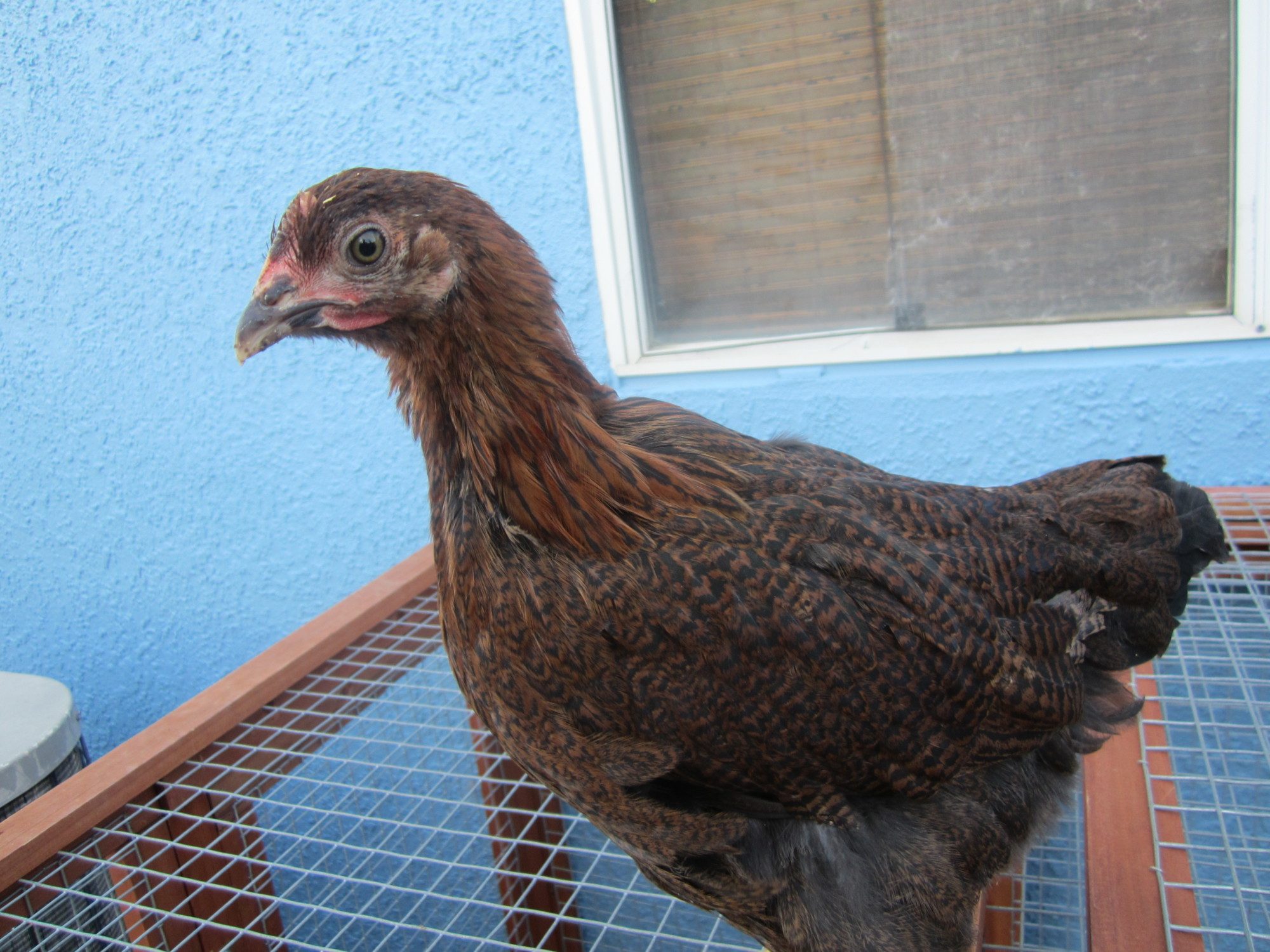 THis is the best picture I have now available. Its the one on the left with *her* head up. She has always been the biggest and the only one whos comb is red instead of a light pink like the other 3. The coloring for them all seems to be the same but they are beginning to moult