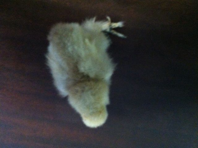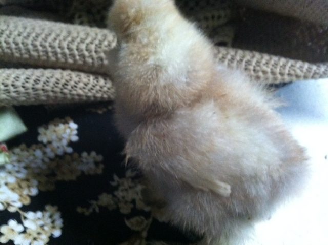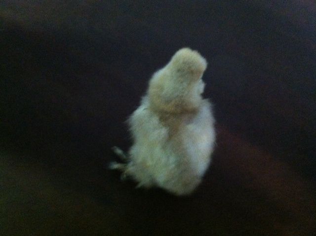 Here's the "funky" chick that hatched from the white greyish one from above. You can see a lot of buff in it in these pics but it has a smoky look to it like its dirty or dusty. I hope you can see the two lighter stripes on either side of its back. SO now what do you think?