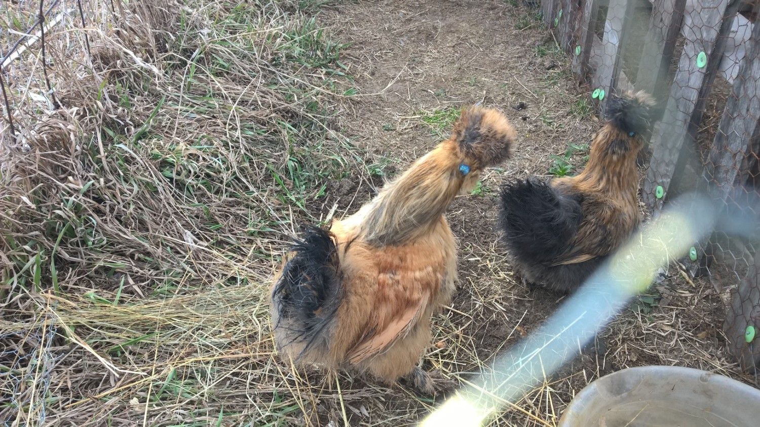 These are my partridge silkies that I have had for about a month. I was told they are 6 months old hens. I love them, they are so soft!, but I have a couple questions if you guys can help me. The bigger lighter colored one is a jerky lol She picks on the smaller one and when I go to sit with them she like tries to fight me. She walks by me and I pet her and she'll puff up her chest and stretch her neck and peck at me. I gently push her back her up some\ and laugh. It cracks me up but I was wondering if there is away to make her nicer. Also, they have some feathers that like stick together/dirty I was wondering if I should put some loose dirt in there for them so they can dirt bathe??? or if there's some other way.