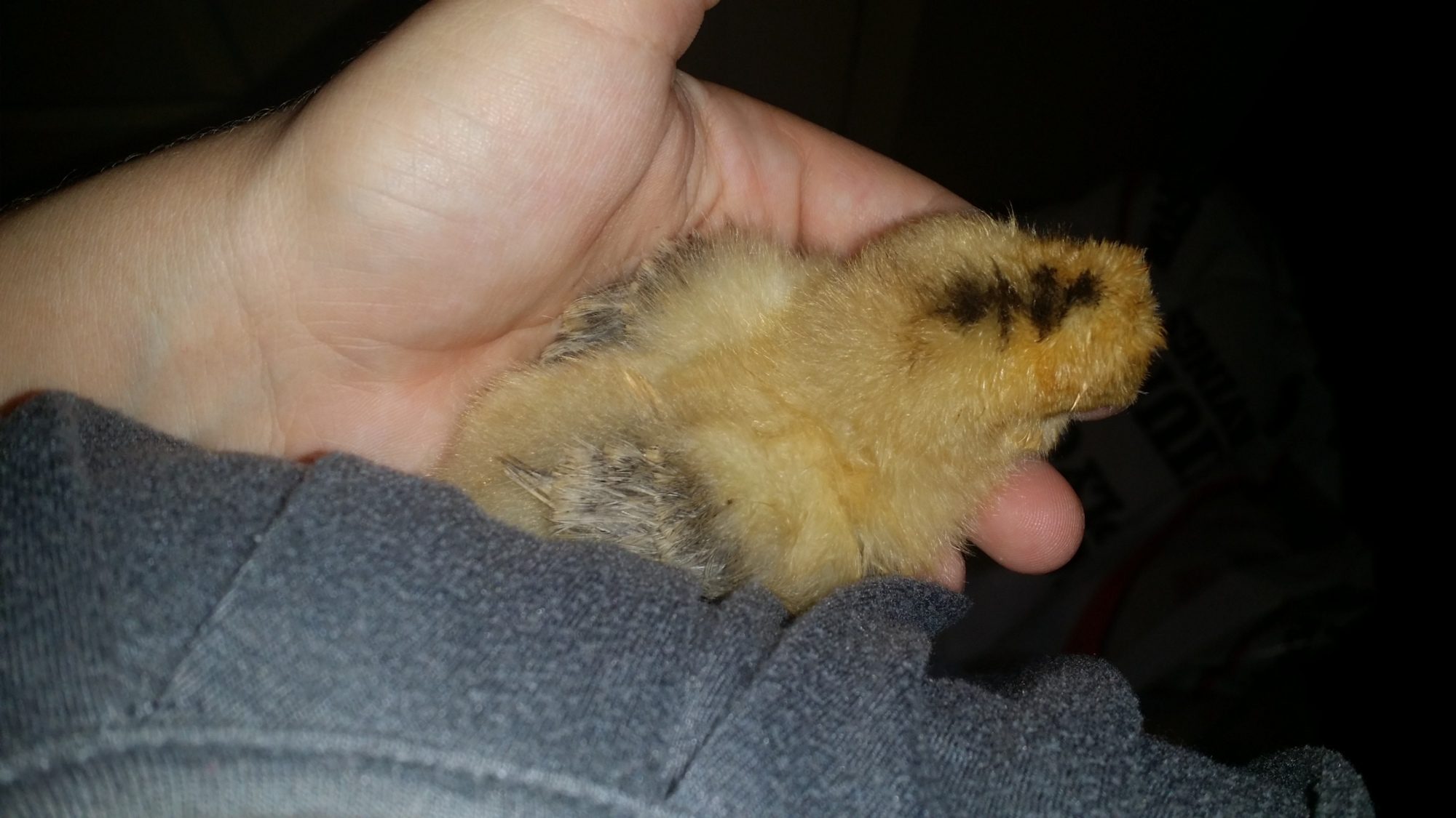 Here he/she is. The two other chicks with similar coloring do not have nearly so bold striping on the feathers, but softer grey with white dots at the end and white necks, like her. I guess I'll have to wait and see what they grow up to look like.