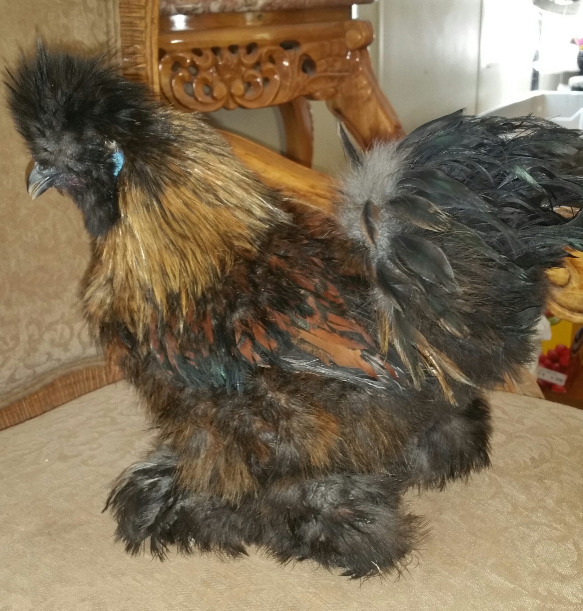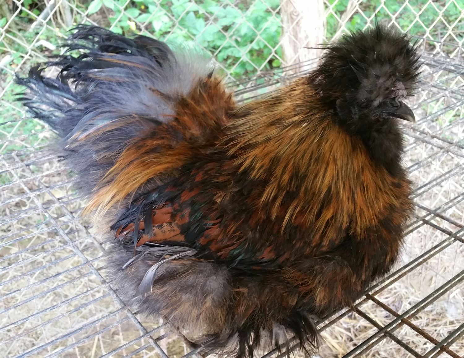I love Partridge for their ability to still look decent after free-ranging a few years. Other Silkie colors fade from the sun or stain from dust-baths but with a standard Partridge they always look good. As you say the feathers like crest and feet may wear down a bit but fading or stains are not as noticeable on Partridge featherings. Partridge Silkie 5 yrs old - colors don't show fading or stains because of the variety of colors in her "coat" you don't know what is a stain or what is her actual colors Black Silkie as a pullet had fairly even black feathering but at 4[SUP]1/2[/SUP] yrs the sun and dust-baths have turned some of her black feathers rusty