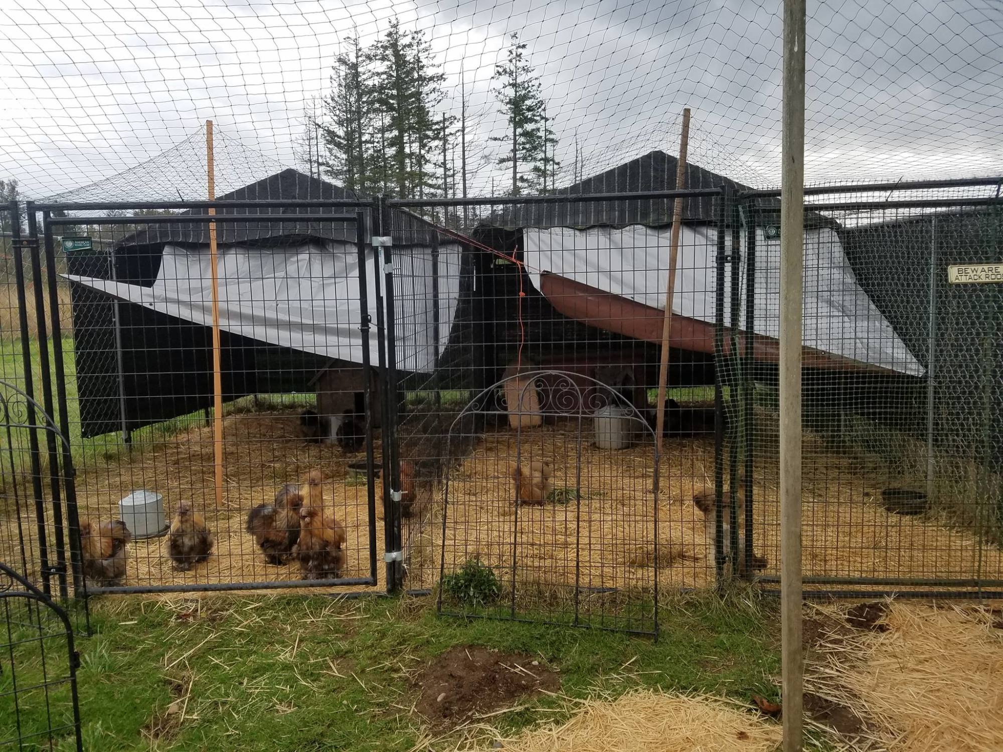 Silkie pens are each 10x20. The pens open to a 20x20 fenced central area that has grass so that each pen can alternately "free range". They have dog houses to sleep in. Wind break cloth around most of the perimeter. 10x10 roofs over each pen, plus the 8x10 tarps to add more rain protection (sloped so any wind goes over). So there is plenty of shade and areas of sun when we have it. Heat isn't usually an issue here. The small fence panels I move around so I can divide up the center area and open more than one pen at a time.