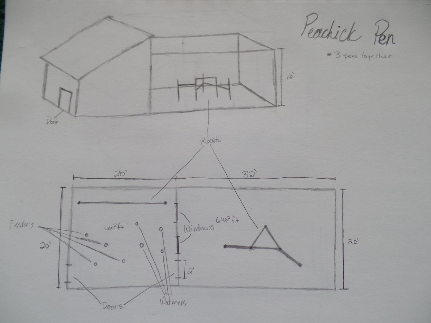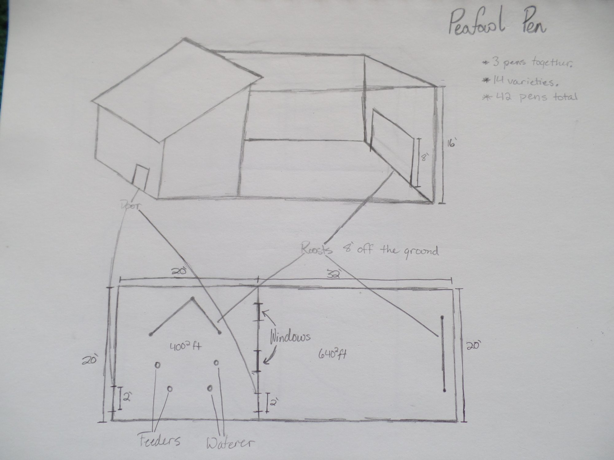 I'm just thinking ahead of the future right now. Just making some blue print sketches, the ones I'm posting now are not final I'm going to make some adjustments but this is just a rough draft and I'm looking for second opinions on is the base concept good or what. I've yet to decide what I'm going to plant on the inside and possible outside. Just to fill in the blanks, Peafowl pens, a trio in each pen. I'm going to put three of the pen sketches together to make one large pen separated into three parts. Each large pen will have a certain variety of peafowl in them. Peachicks there going to be 3 separate pens in one large one based on the peachicks age. Each large pen contains a certain variety as well. I'm going to do better drawing to try and show what I'm talking about but for now it's a rough draft and let me know what you guys think. Plants I'm considering on planting is Rye grass, and possibly alfalfa as well but not sure how well the alfalfa will do. Anyway, please comment and ask questions if you have any and I'll get working on better sketches.