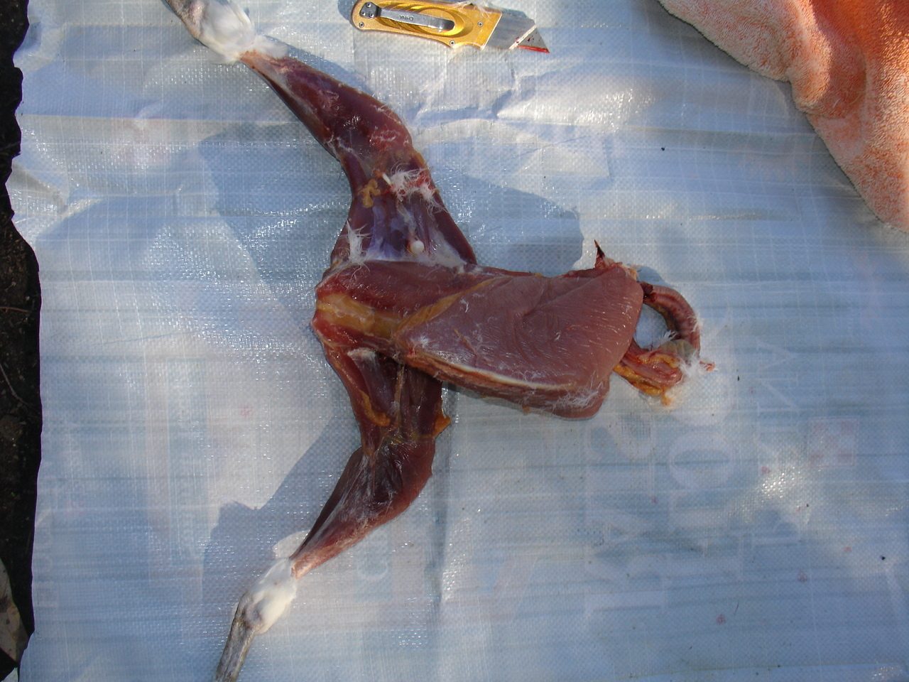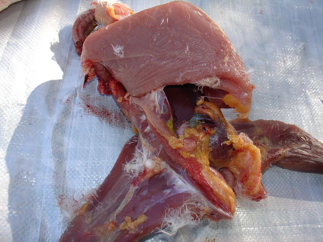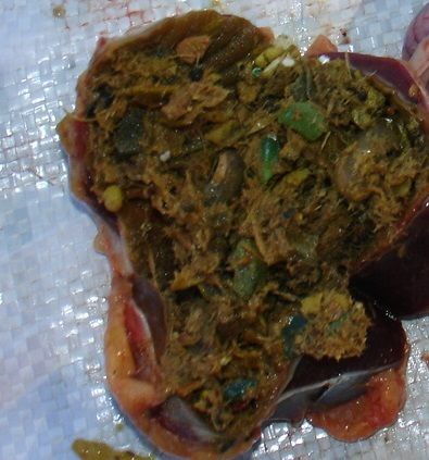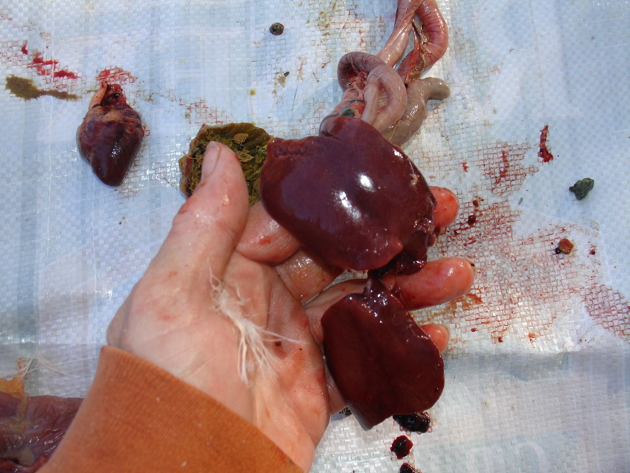 No, i didn't, even so i don't know what i was looking at, the only think i thought i saw is that liver damaged, this are the two parts of the liver:Othman, did you find any part of the insides that looked like they had ruptured? I just don't remember the intestinal cavity looking that "messy" on chickens I have butchered....