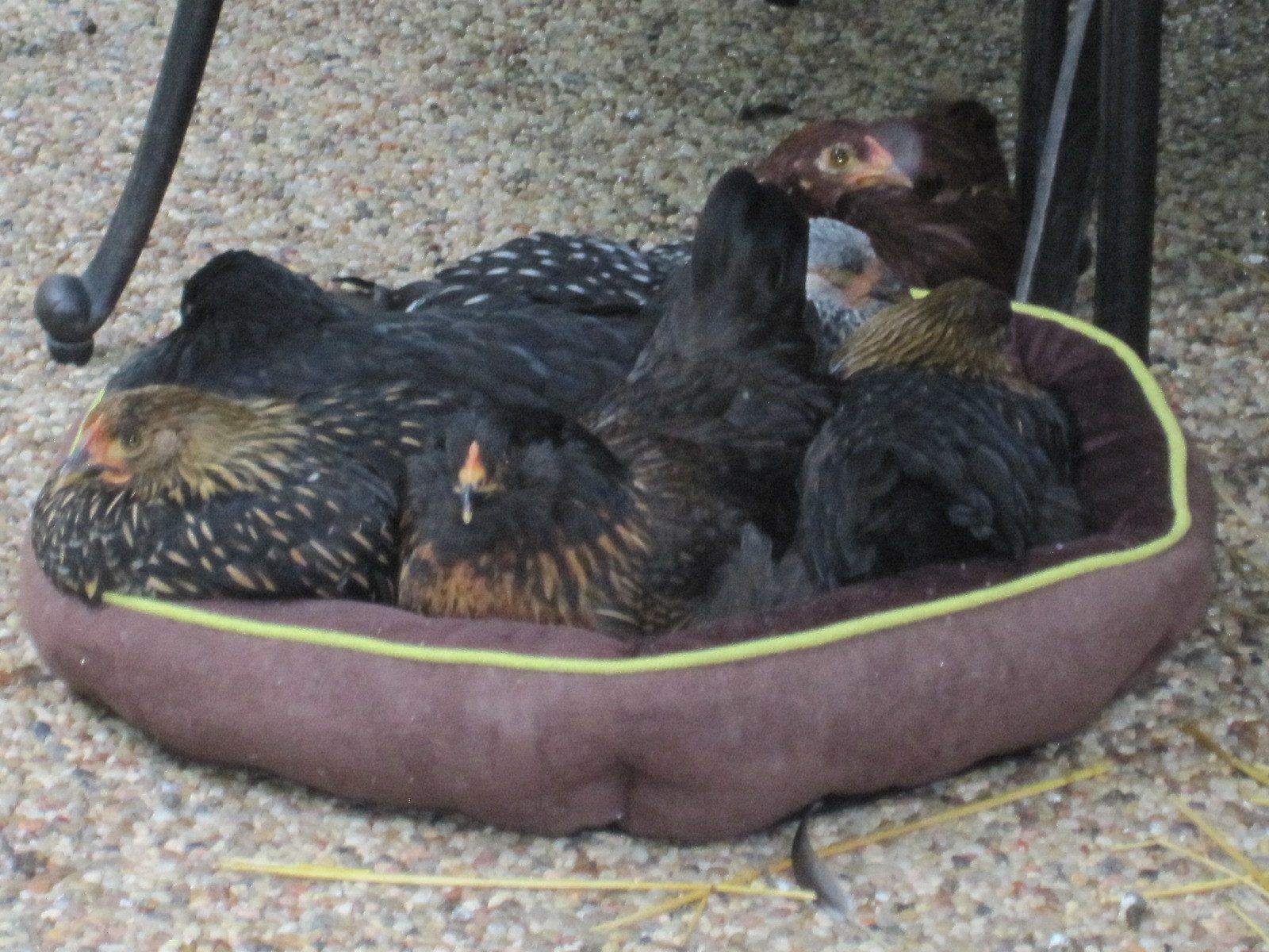 Alright, its official, my birds are very, very spoiled! With all the rain we've been having, my peahen was bringing the chicks under the covered patio area and lying on the pebble floor with the new peeps under her. It looked so uncomfortable! Well, my daughter was SO..embarrassed when I bought a little dog bed at the drug store to put down on the hard floor for Mamma Lucy to use as a nest. Well, the chickens have claimed it, and we have chickens "circling" the nest waiting for an opening. I think we need a bigger dog bed !