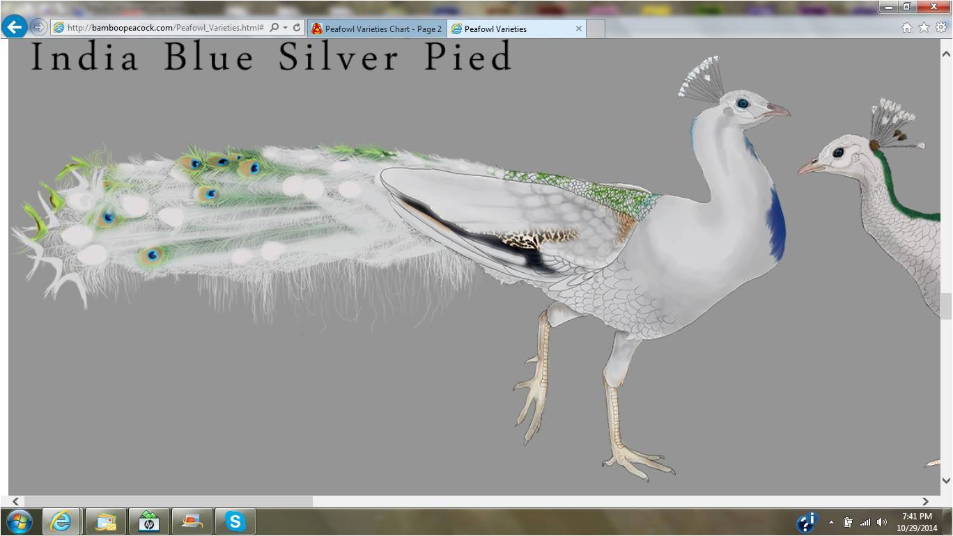 I think the Indian and India Blue is roughly nothing more than tomato, tamato. I was thinking because I've seen people list White peafowl under both pattern and color and I was thinking how can it be both. Then I thought well White peafowl have created the WE, Pied, and Silver Pied. So maybe the White has all of those genes in one while have it's color white as well. I'm pretty sure that I'm probably wrong but it was just an idea that was going around my brain.