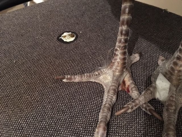 1. I am not 100% sure that;s how she got the injuries but seeing her do that last night made me think she did. Do you think the feet may have a disease and she self inflicts the wounds by pecking at them because they itch?