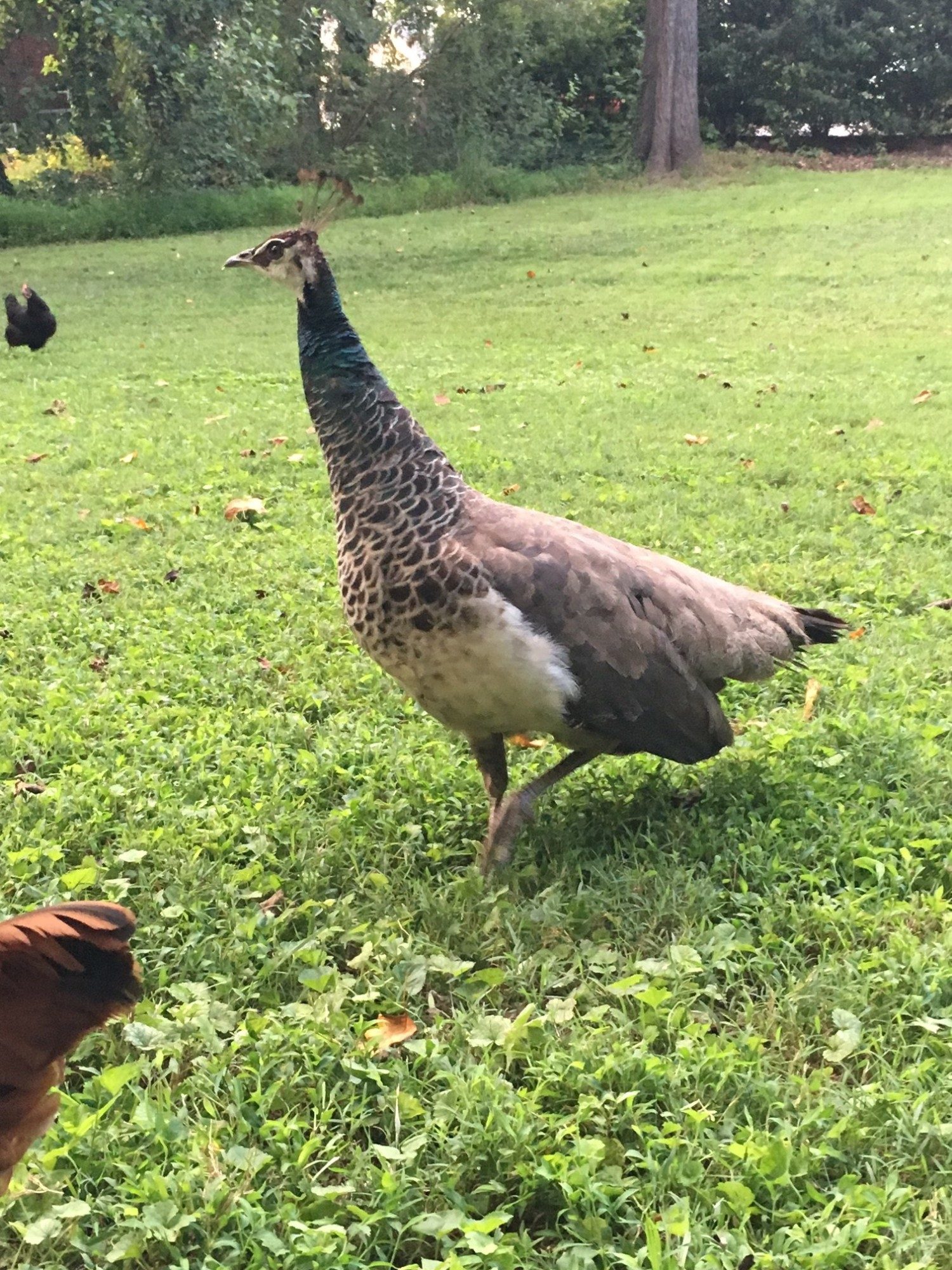 About two weeks ago a peahen showed up in our yard and has been there ever since. My guess is that the sound of our chickens drew her in.