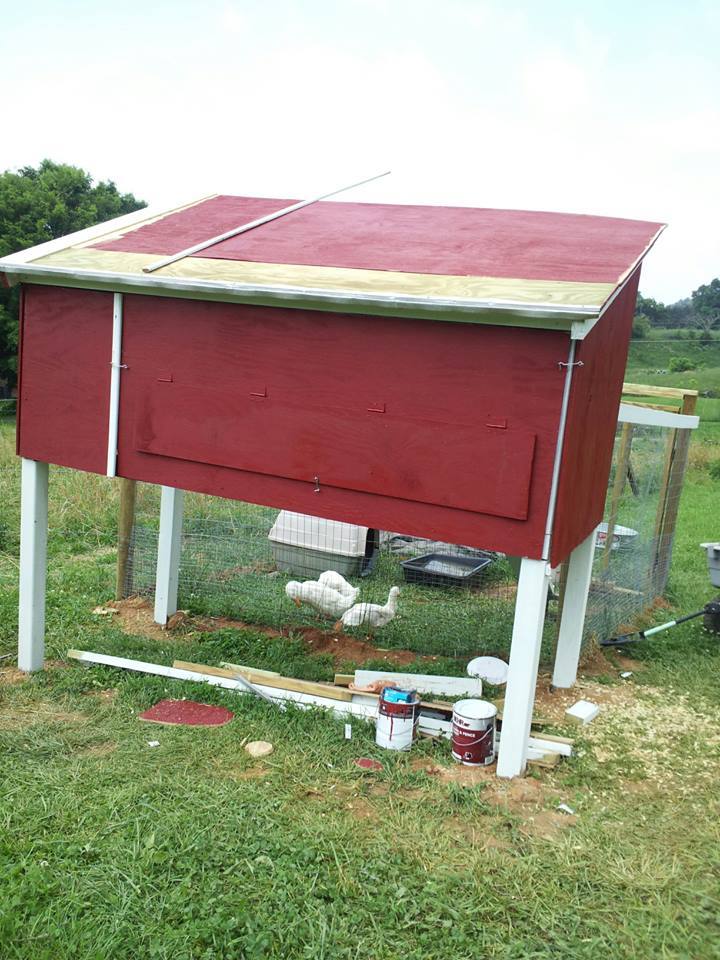 We let them free range when we are home and we put them in a pen when we are gone and at night they have their coop. it is all still a construction site but liveable with all the rain we have been having work has pretty much stopped the past week. On the coop we still have the shingle the roof and add all the trim work and my I think we are going to add a couple small vents for better ventilation and some painting to finish up. I am going to take out the dog house now that the coop is done and they have access to it. We plan to cage in the bottom area underneath the coop so they can have shade without having to go into the coop. We plan to deck in their small pool and add drainage pipe to it. We are also trying to decide on if we should add a top to the cage. And the biggest question of all what to do on the ground because it is turning into a mud hole and they love to play in the mud.