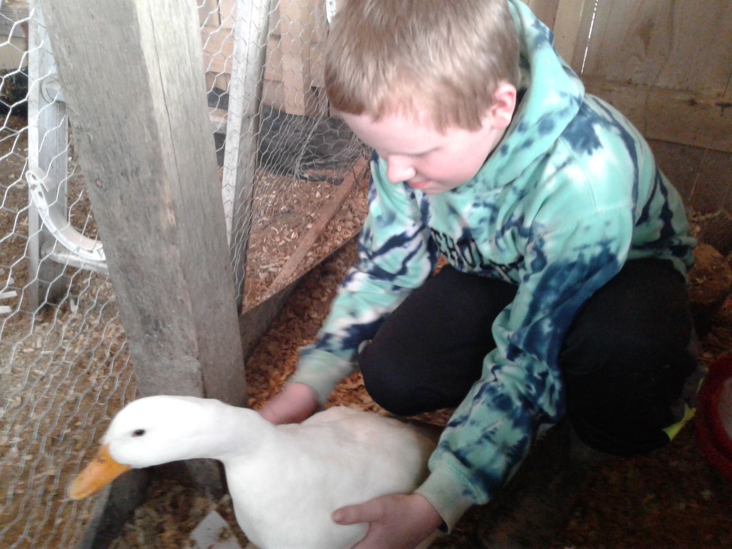 Aww how preciousPoor Chatty got handled roughly by a Muscovy. Kinda scary when your white duck goes walking by and she's red... She's okay and her and Kathy are back with the flock. I had no idea how calm she is once you get a hold of her. We had them in the separate section of coop and she'd walk right up and let you pet her. My son Daytona helped clean her up and I think he has a new favorite!