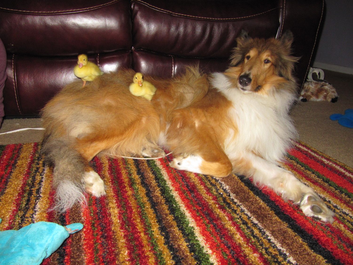 OMGosh!! That is the cutest pic!! Smith and Wesson were hatched by a jersey giant chicken. So, when I got them, I actually bought a black feather duster for them to hide under. They'd hide in the feathers and peek their little bills out. It just cracks me up what the ducklings decide to bond with!!