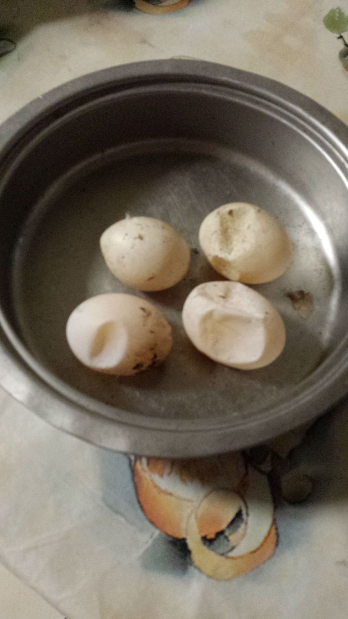 Stella starting laying probably a week back and her eggs were lovely shape and size I even made some delicious quiche. But Tuesday morning I noticed an egg in the pond it was soft, I thought because it was laid in water. That afternoon dad found another soft egg and this is a picture of all the eggs after that.