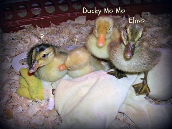 (From left to right) No name yet, my 11yo DD is still deciding, No name yet, I will decide today ( this is the little one with the leg issues), Ducky Mo Mo - this one is my 6yo DS's duckling, and Elmo - who now belongs to my 4yo DD.