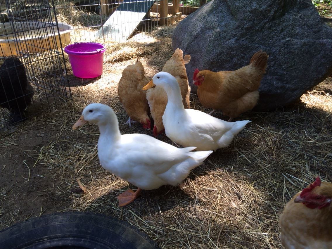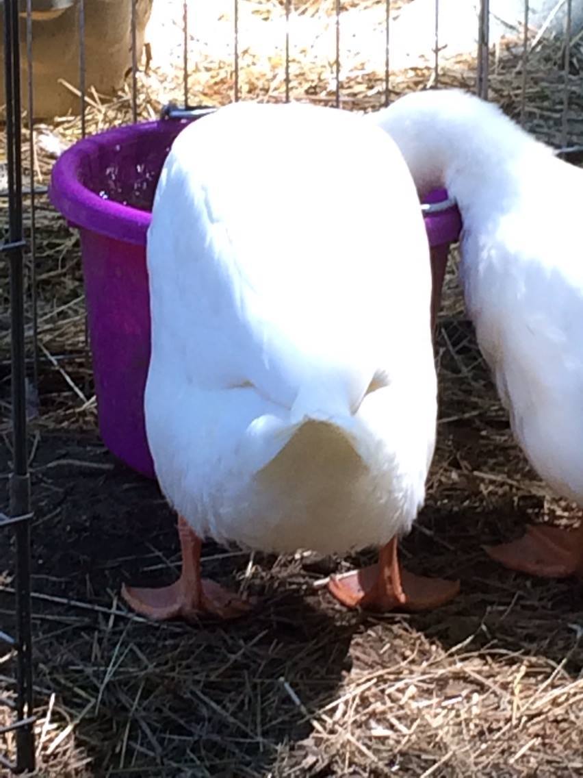 2 pekin's here! I have 1 drake(Aflac) and 1 hen(Flo) who is currently sitting on her first "litter"... I'm new so I don't know much terminology, lol. Est. due date is June 10th...I have questions though. They are in a pen with a rooster and 6 hens (chickens, who all free range during the day)