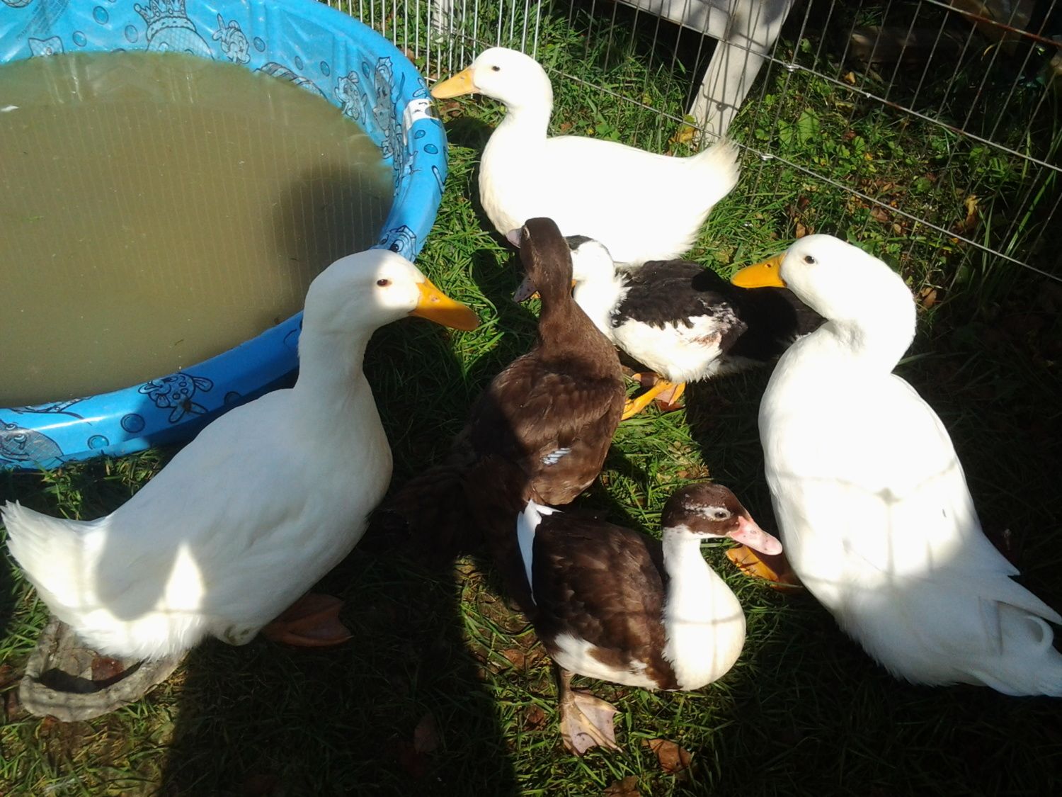 Here are the two hens from the meat market, along with frosty to the far right, and the baby muscovies in the midst. They were so happy because they got ot swim in water for the first time. The far left is anna, and the middle one is elsa. Anna and elsa :). They looked in good health, besides some cleaning they could do themselves.