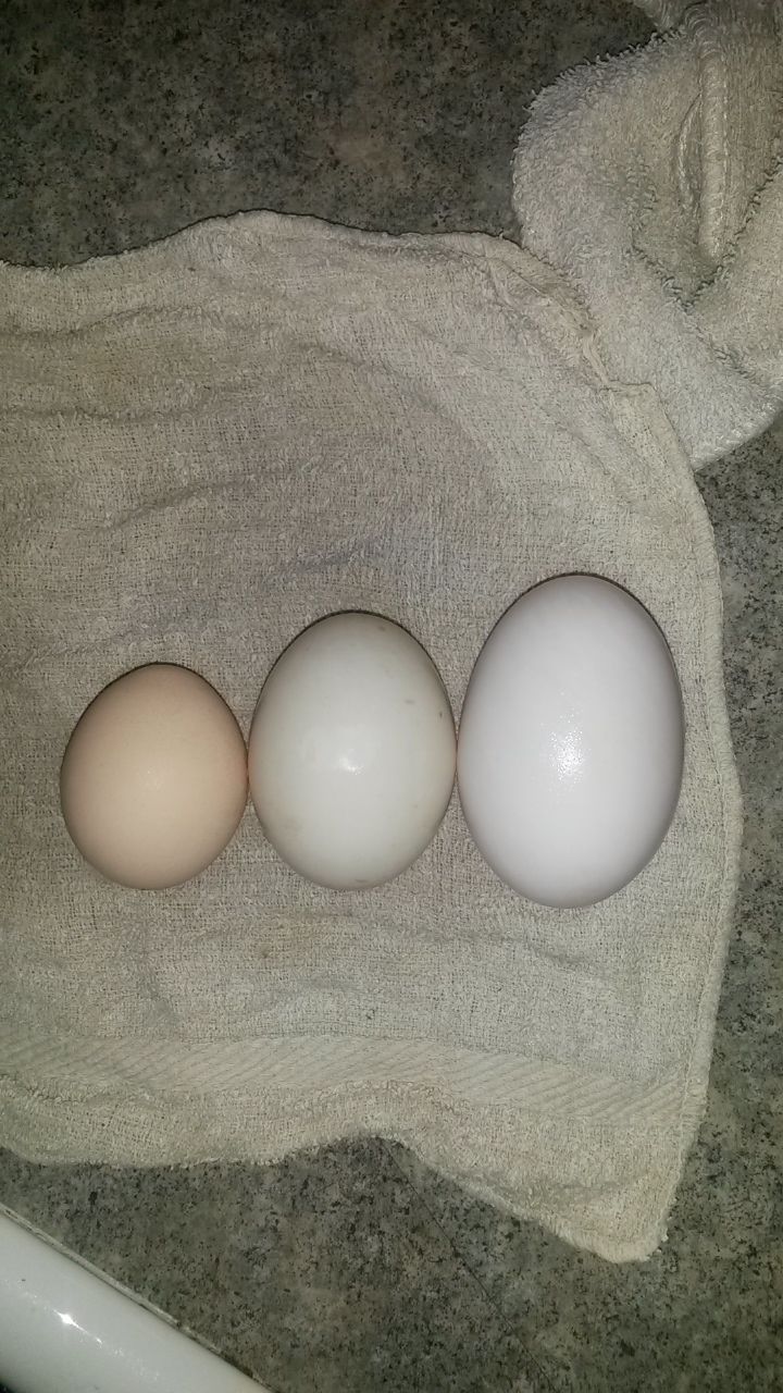 In order a from brown too giant... regular sized chicken egg, regular side Pekin duck egg, then giant sized Pekin egg. She must be hurting! Oh and it's not a double yoker!!! Should I hatch it?!?!?