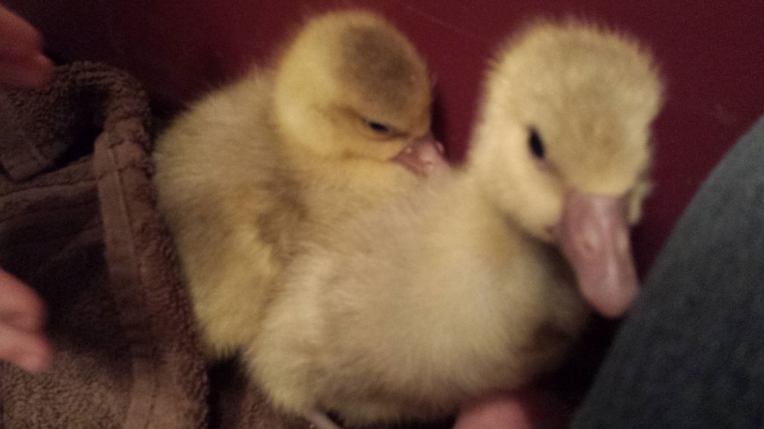 Hello everyone... I know this isn't a goose thread... BUT... We just got two new members to add to our little flock family! Hopefully our two pekins learn to accept them as they grow. I couldn't resist sharing!