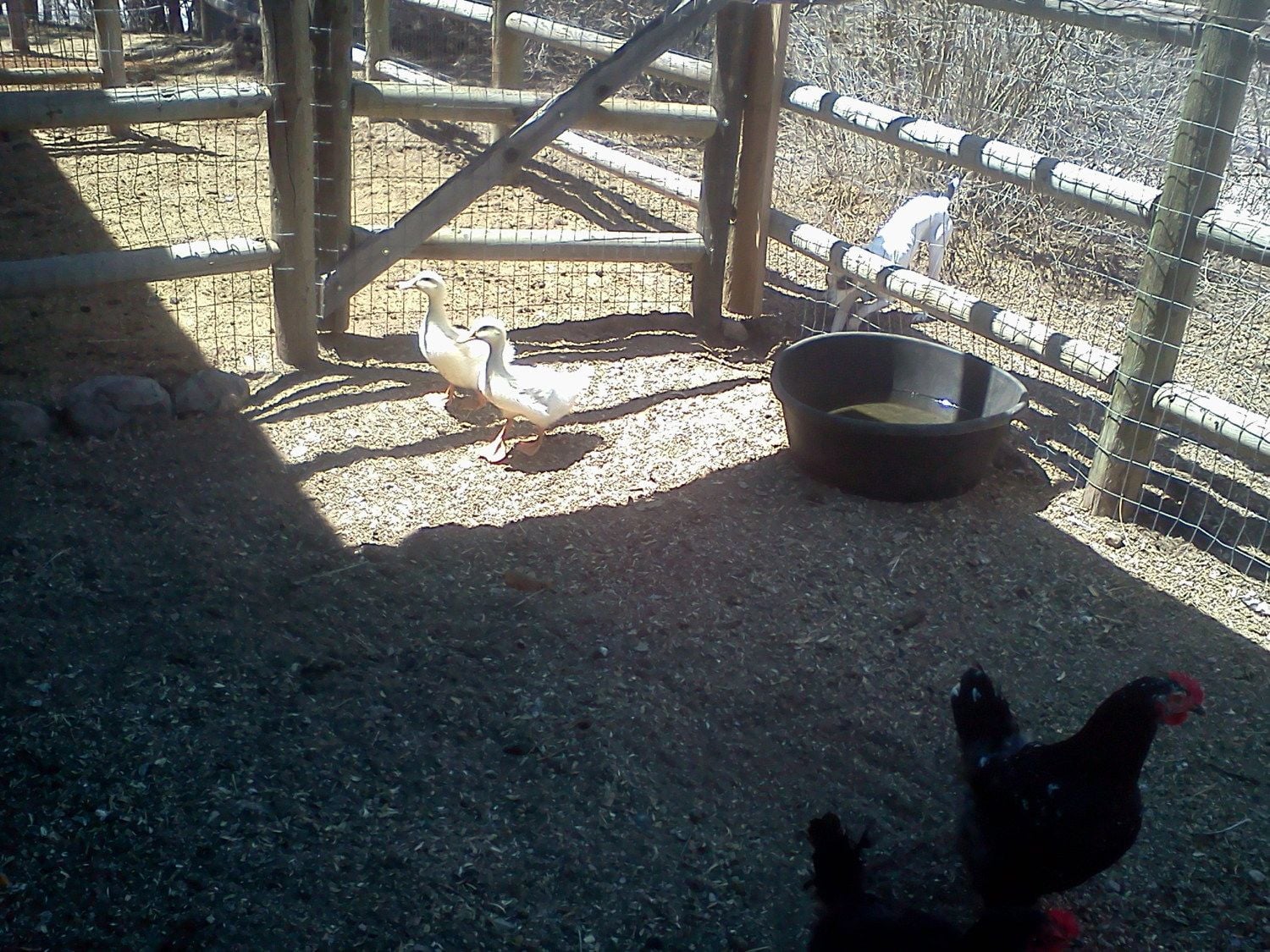 AFM: We may have had a break through this morning. Or it may have been the fact that I fed them peas last night by hand. I was cleaning the coop and both ducks came up and started nibbling at my clothes - normally they run to the other end of the coop while I am cleaning.