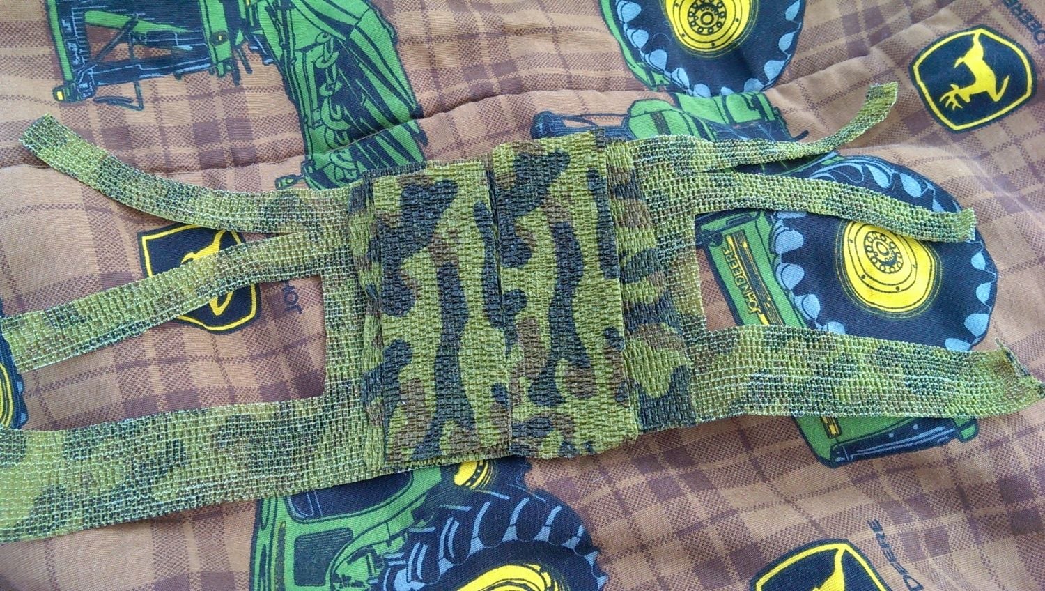 Vetwrap H with cuts to make 2 sets of straps for the head. Note the padding in the middle.