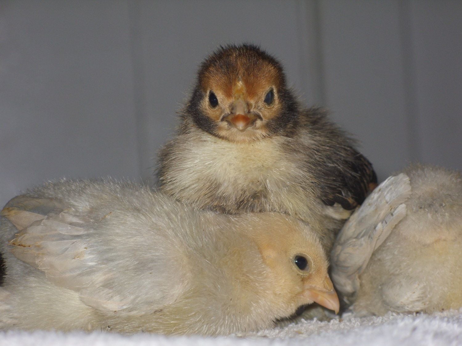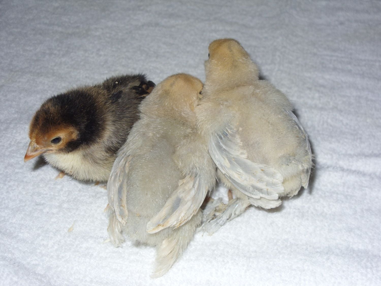 I managed to wear down my mother and got three bantam chicks from the feed store! No names, yet, since they're straight run and I'll have to give up the roos. I can't get over how tiny they are. I can carry all three in one hand! I think you guys were right and these are porcelain d'Uccles. And a Sebright. It was shy, so you can't really see its signature pose. Snuggles~ Fighting over who get's to snuggle under the Sebright.