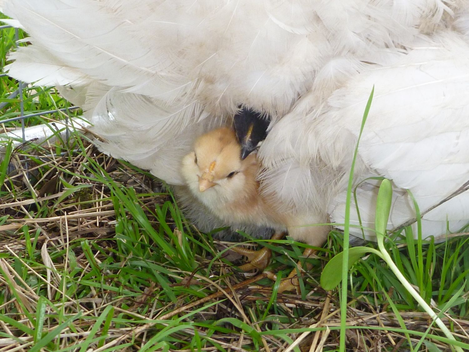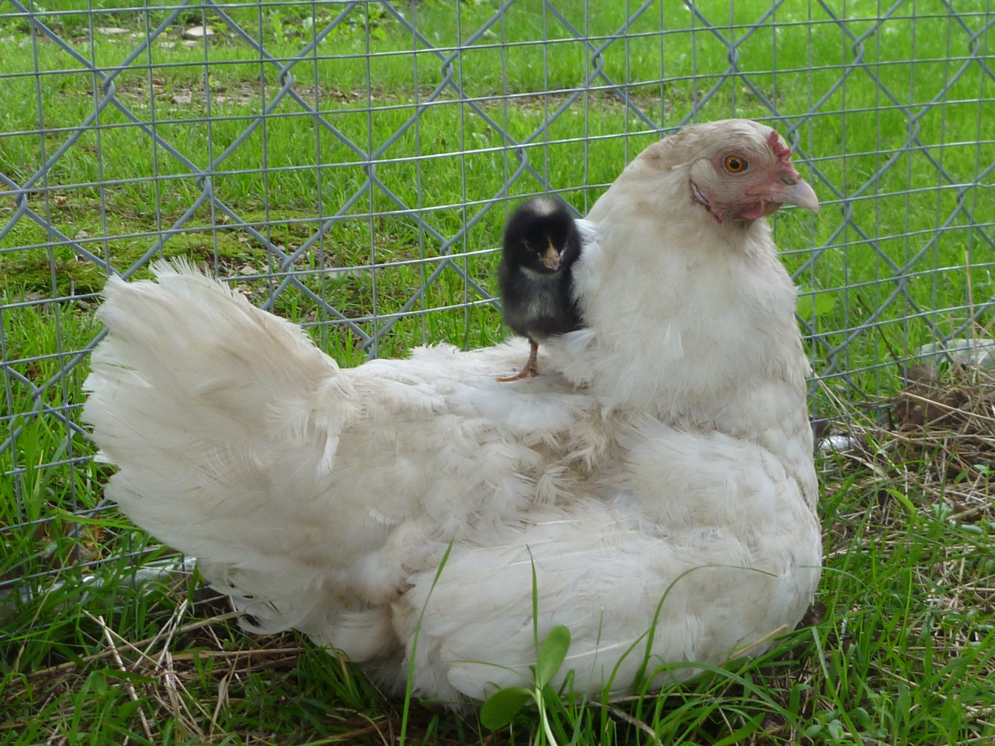 Well, a few days ago Gracie decided she was done being broody with her crew and she went back to her roost, they are nearly 5 wks old and were doing fine, but obviously missed their mama hen.... We decided to put Janeway and her bunch into the big broody area with Pidgy and her crew and the crew of 'orphans' as Radioman calls them. Lo and behold the first night after she was in with them we go to lock them up for the night and find that Janeway has adopted the orphans! So she now has 6 of her own (1 wk olds) and 4 of Gracie's (5wks old) and they seem to be all quite happy with the set up! Got this pic of them tonight before we locked up. If you look closely to the lower left of Janeway's chest you will see a little puffy white head peeking out... that happens to be one of Gracies chicks, and in fact is a mini Gracie, (white Silkie mix from one of Gracie's eggs)