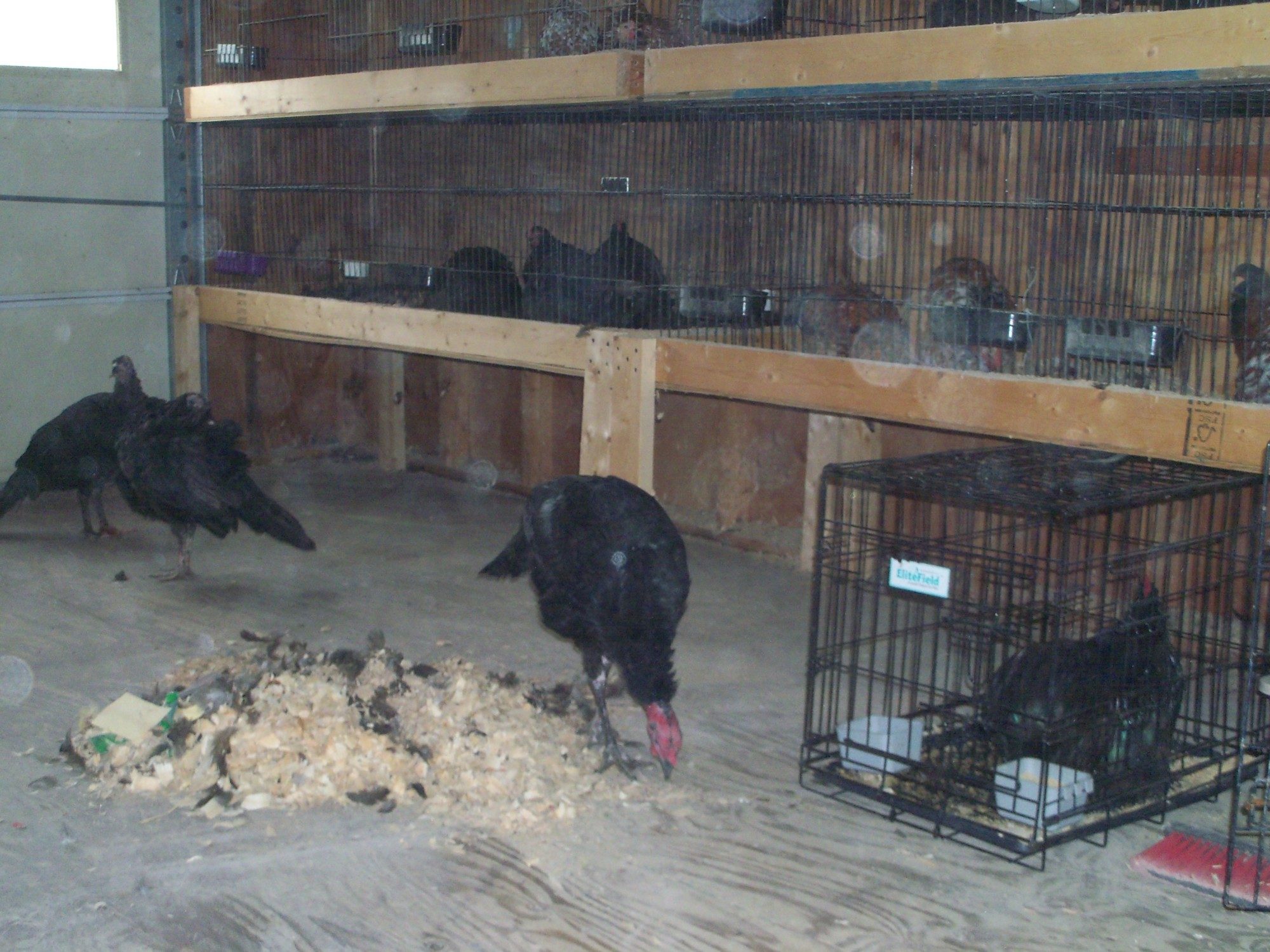 They are wandering around in my 12x24 shed that holds my 2'x7' bantam Cochin breeding pens. They are in 'quarantine' yet. I swept and vacuumed my shed floor while they were running around. I don't know if it's because I am new to them, but they are not very outgoing. And they have no idea what mealworms are. If they do, they must not like them. They did like digging through my swept up pile though. I had to re-sweep it 3x before I shoveled it into the wheel barrel. At one point the tom decided to get the 'bird's eye view' from atop my pens.