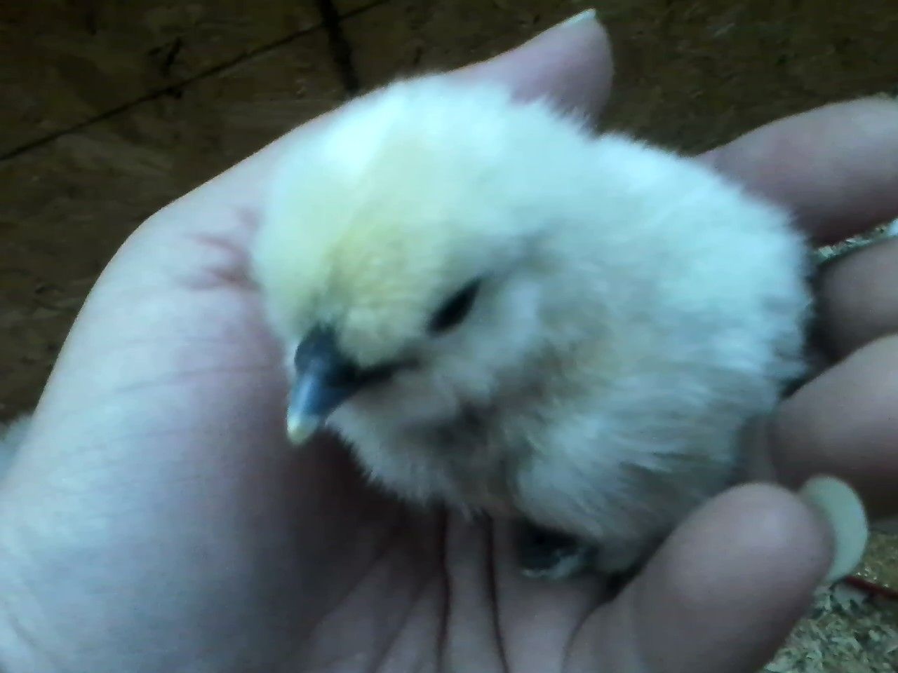 My little silkie that hatched. I wonder what color she will be. Momma is a white silkie and dad is a porcelain. She's so cute