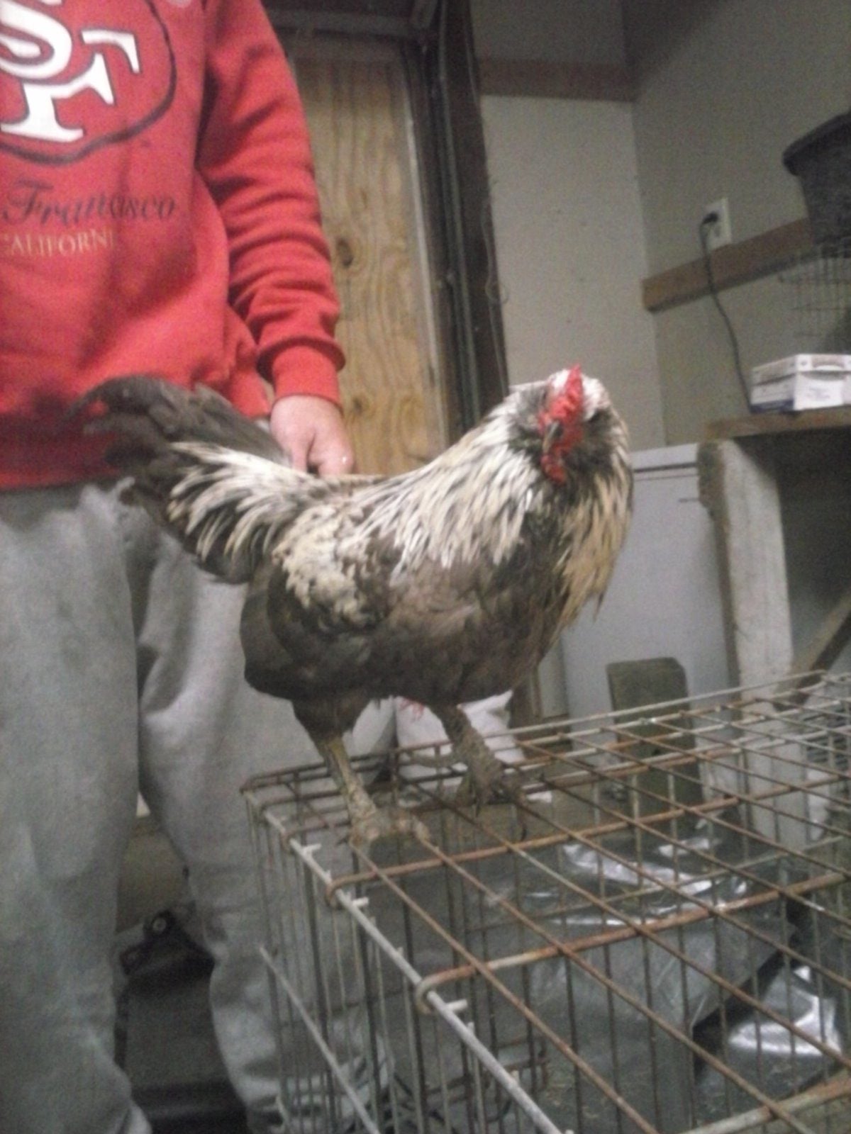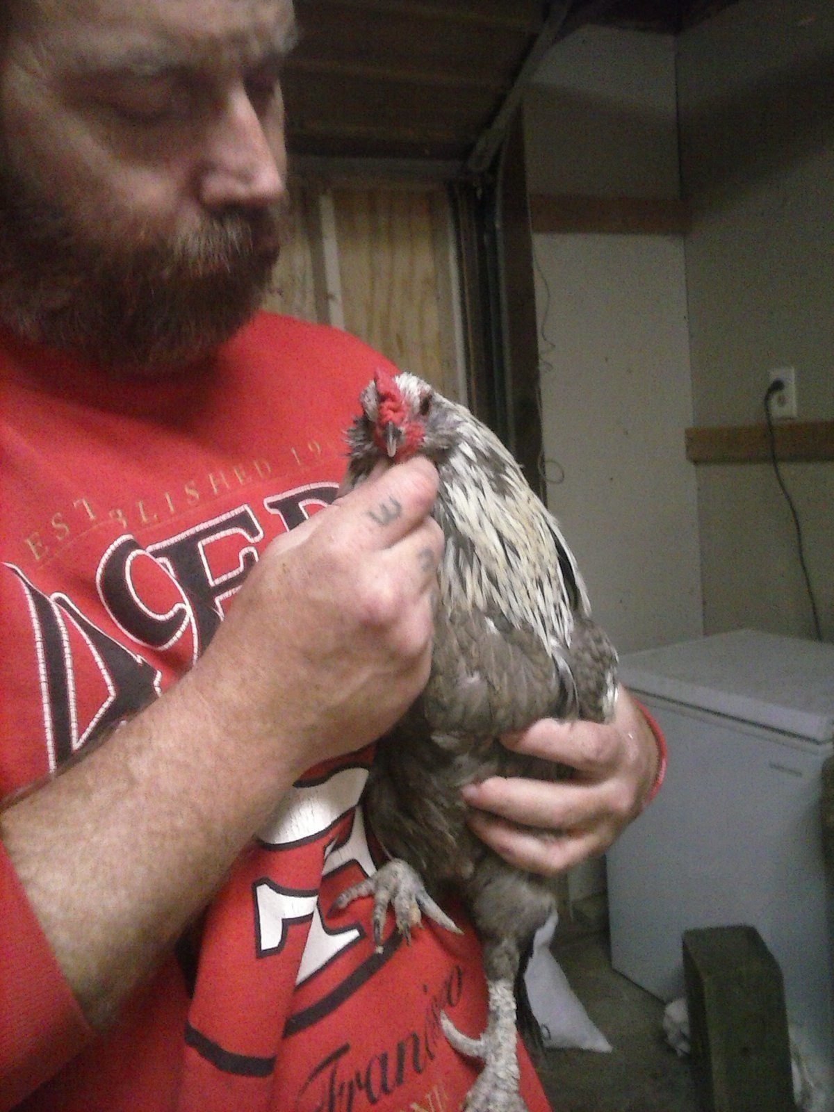 Wing: Here is the daddy roo. As you can see, he's really calm & likes his neck scratched. His legs are really dark blue. Ignore the scaly look. He has beem treated 4 times since I got him 10 months ago. It's just the darn bead skin still flaking off. He looked AWFUL when I got him. Had to have ivermectin & crisco both. He looks much better now.