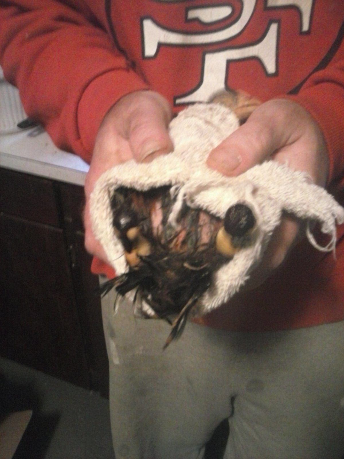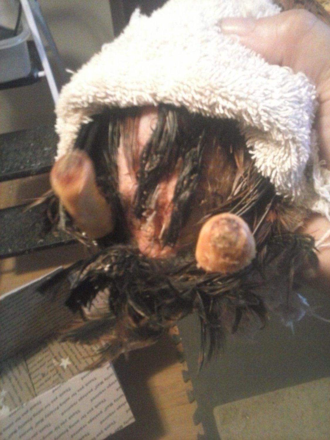 She now has a name, Miss Stumpy. Her feet have fallen off. I gave her a soak in warm diluted peroxide water to clean her stumps.