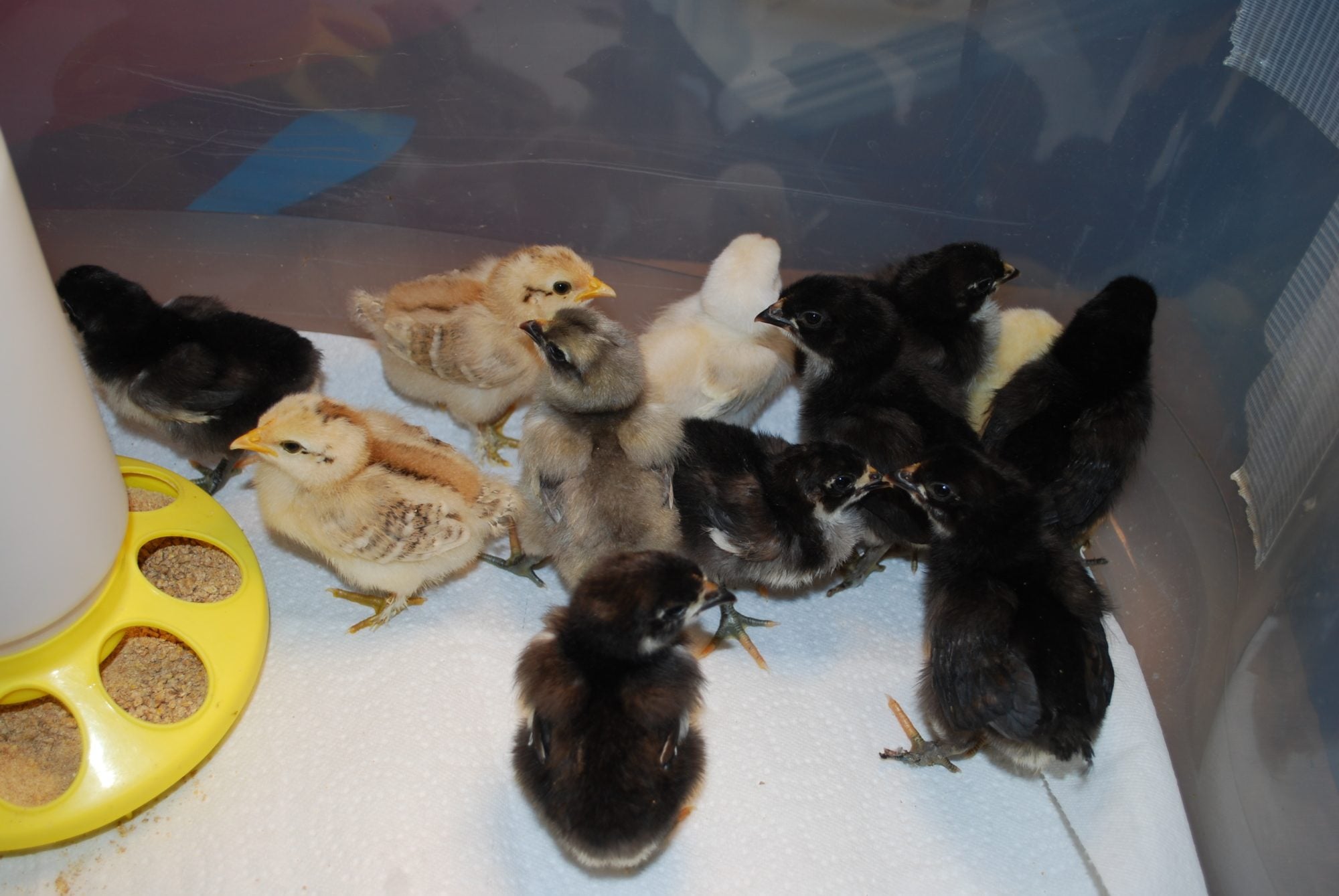 [COLOR=0000FF]Back with a Chick Pic.  All Twelve.  I'm Loving the MsLadyHawk mixes.  All four are very different from each other.  It's funny that the BC Marans and the Black Orps look so similar that's it's hard to tell them apart without looking for the leg feathering.[/COLOR]