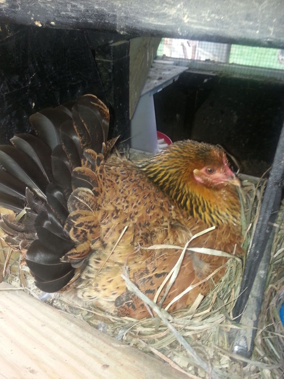 So today I had some of the chicks outside in a couple dog crates with the bottoms removed so they could forage and play. As I was watching them, the wind blew and ruffled some of Joel 's feathers and I saw red on his back. I panicked! I thought it was blood! So after I managed to catch him (for sine reason he's terrified of people) and look at his back, I realized that is just his new saddle feathers beginning to grow inthey are a DEEP mahogany/reddish color. Right now he's just sold black with that beautiful green Sheen to his feathers. He's going to be a stunning boy I think.![]()