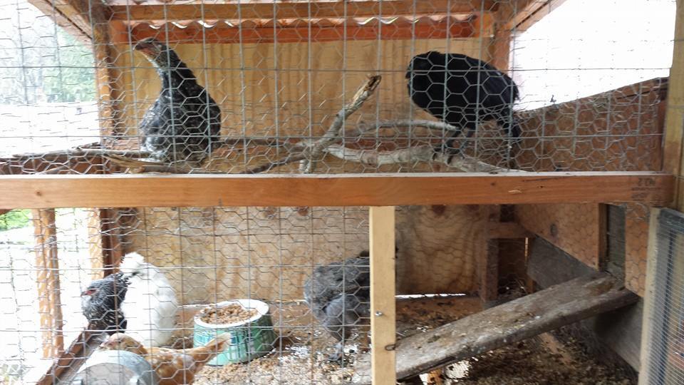 If I don't close off the apartment, however, they all jump up onto the two crisscrossing roosts in the upper area of the apartment and snuggle down into a big fluffy ball of feathers and go to sleep. I'd leave them there but for two main concerns. One, two of those "bantams" are actually my Brahma chicks. I can't imagine how this arrangement is going to work out long term when they are 10 to 15 lbs and still trying to snuggle up there with the bantams. And most importantly, the apartment is not fully enclosed. It has a solid water proof roof that it shares with the rest of the run area and main coop. The back wall is closed off on the bottom by the old quail coop and the outer wall is a solid piece of beadboard. But the floor, front and inside wall that faces the main coop are all open hardware cloth and chicken wire. I'm now trying to figure out if I leave it as is for the summer and leave them choose to sleep in there if they want, is it ok? And I guess I could just work on enclosing the front bottom and inside wall and make it into a full blown mini coop for the winter. I still don't know if I should try to make the Brahmas go into the coop with the full sized chickens or leave them in there with the bantams to keep them warm.