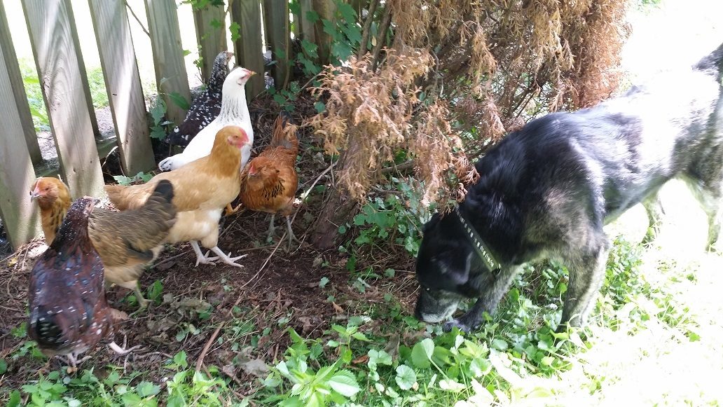 Jada trying to make friends with the girls. I think the shepherd in her wants to herd them.