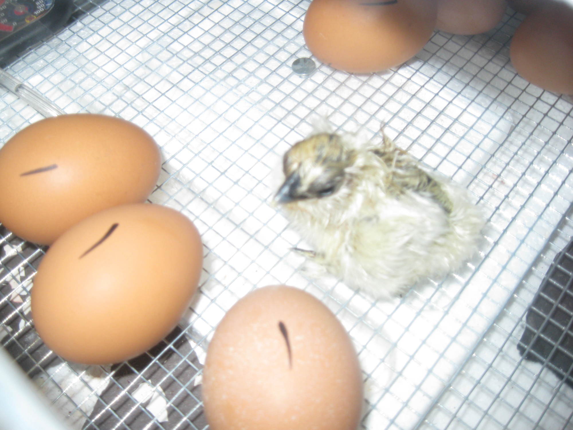 Kids started coming early so I could only RUN down and snap a quick one and check on temp and stuff!!! Is he supposed to be matted yet, he is dry and he is well formed, just tiny tiny see him next to thoose other eggs!!! Are they supposed be this tiny, my other two werent!!!! wondering if Mypet chicken strikes again???????????