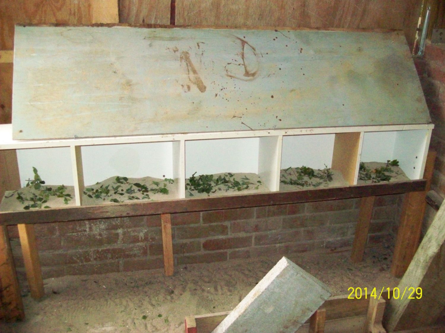 converted bookshelf into nest boxes...the little bits in the sand are herbs.