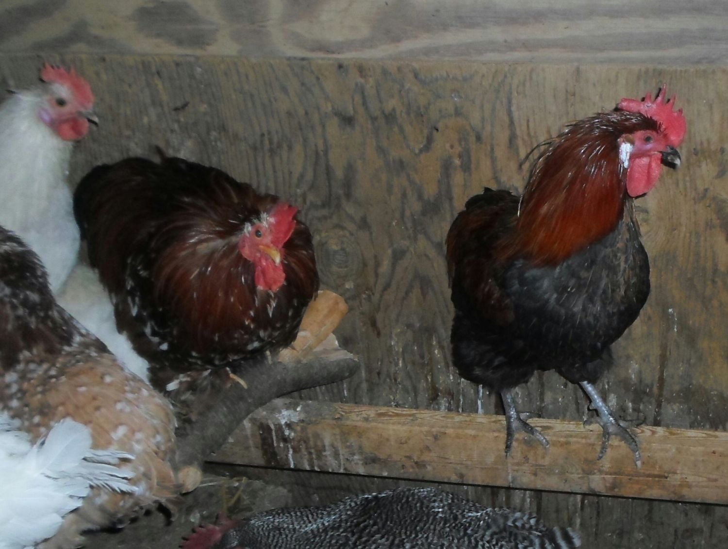 Dominique roosters, take two, I will throw in a hen. ( really do not want to process these boys )