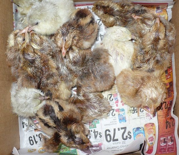 I've got a temporary cure for the winter blahs! First, last week's young ladies, coming back for a cameo . . . Miss CCL, Miss Welsummer, and Miss Rhodebar (from left to right) Now for some of this week's new entrants . . . Welsummers and Blue Egg Laying Sex-links (in blue and black colors) Next we have: Rhodebars (12), Ameracaunas (3) and a very white mystery . . . Could it be? YES !!! My first ever poult, a very little Midget White . . . :weee (queue the happy dance music) Will he/she be spoiled? Yes, yes, I think so.