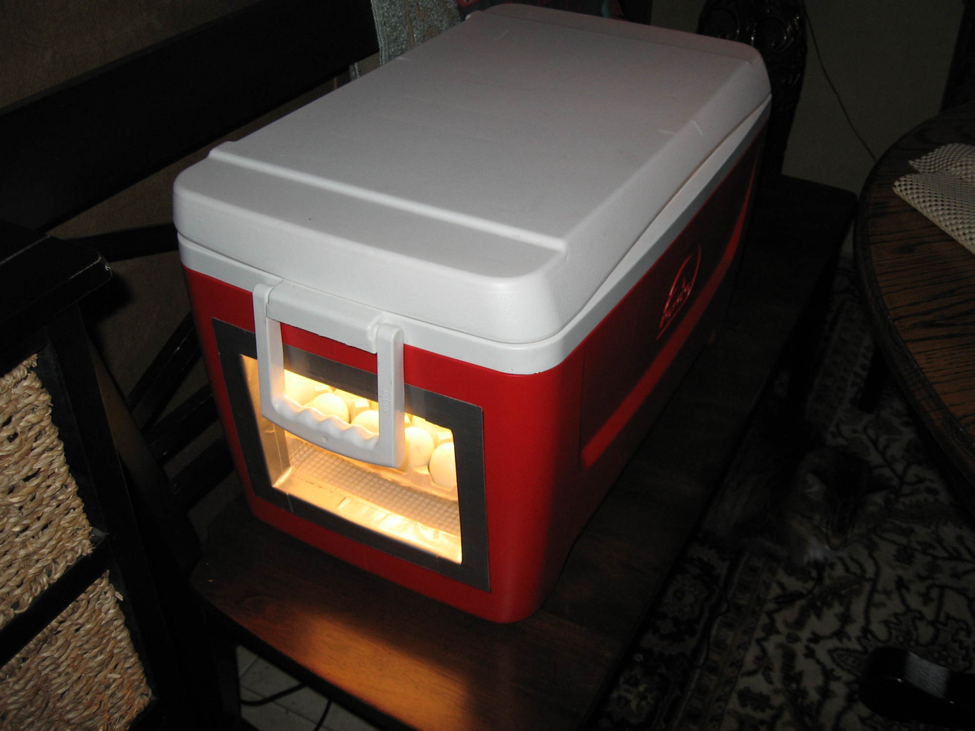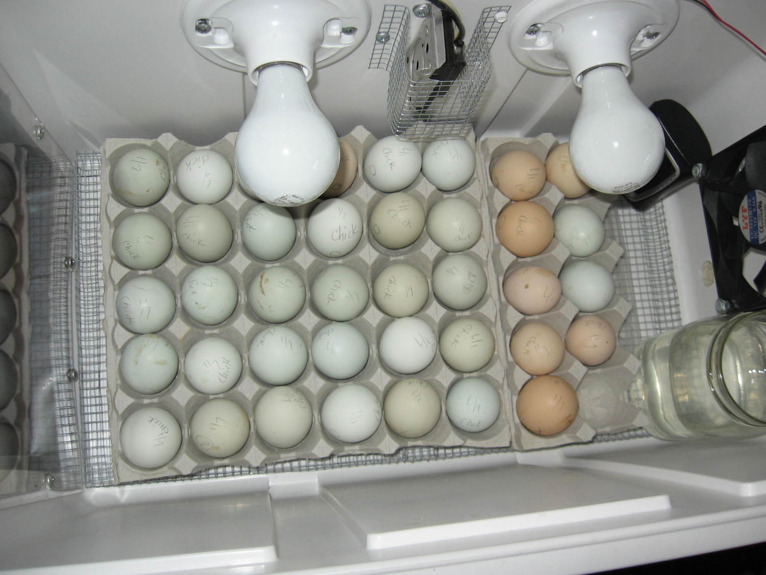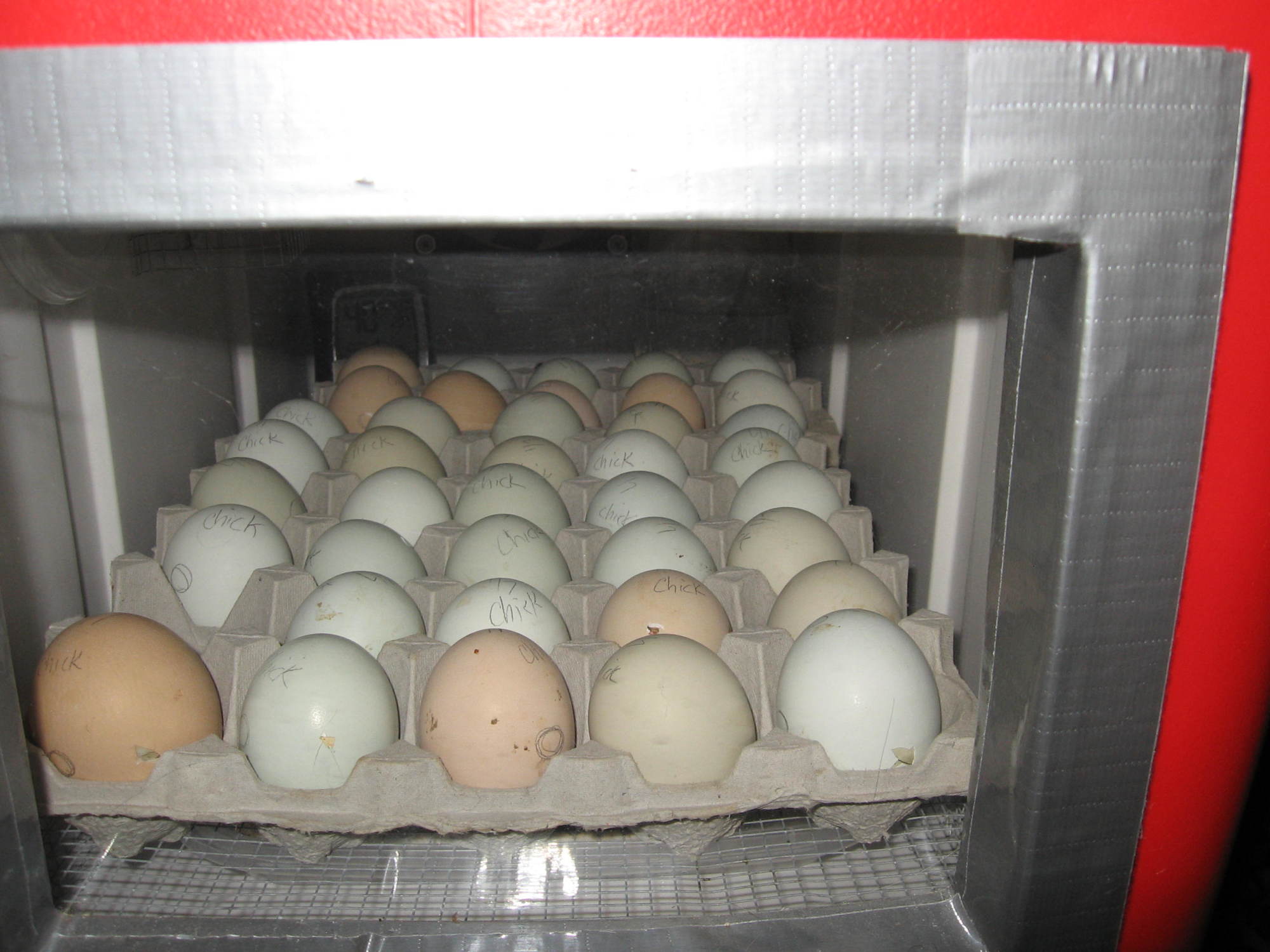 yesterday, it was the Marans and Ameraucanas who were rocking their shells but today it's a Rhodebar with the pip.Cabinet incubators position the eggs like that, but then tilt the entire tray at a 45 degree angle, and reverse the tilt to turn the eggs. I wonder how these get turned.Oletmyer: