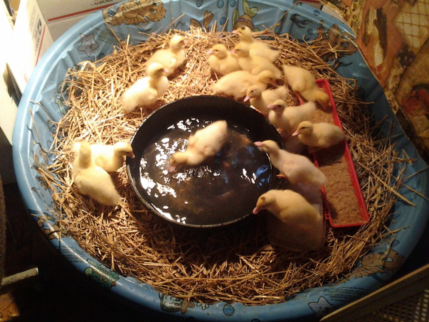 ducky update.... still not a big problem, but I do not leave food and water in 24/7......figured if they would be outside with a broody she would only take them to food and water a few times a day....