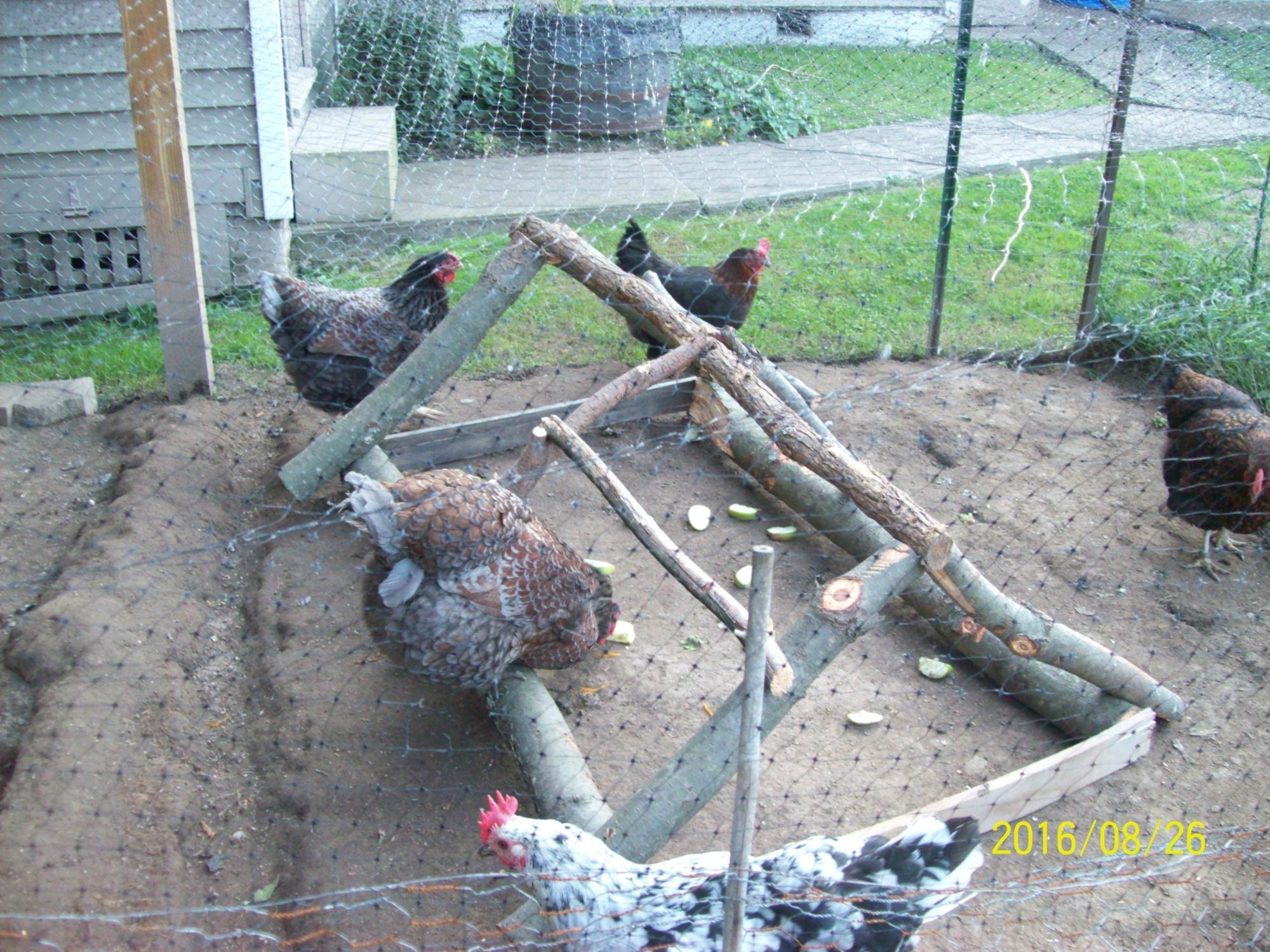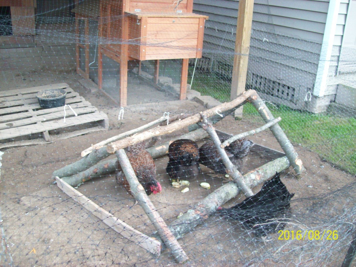 A very large branch from a neighbors tree broke into our yard last storm we had. I thought the girls would be a little more entertained with something to "play" on/in ...so, DH made them this. 99% of it is made from the lrg. branch, 2 pieces of pallet wood were added for stability. I threw some apple pieces and tomatoes in there to get the "over" it being a new scary thing in the run...didn't take much did it?!