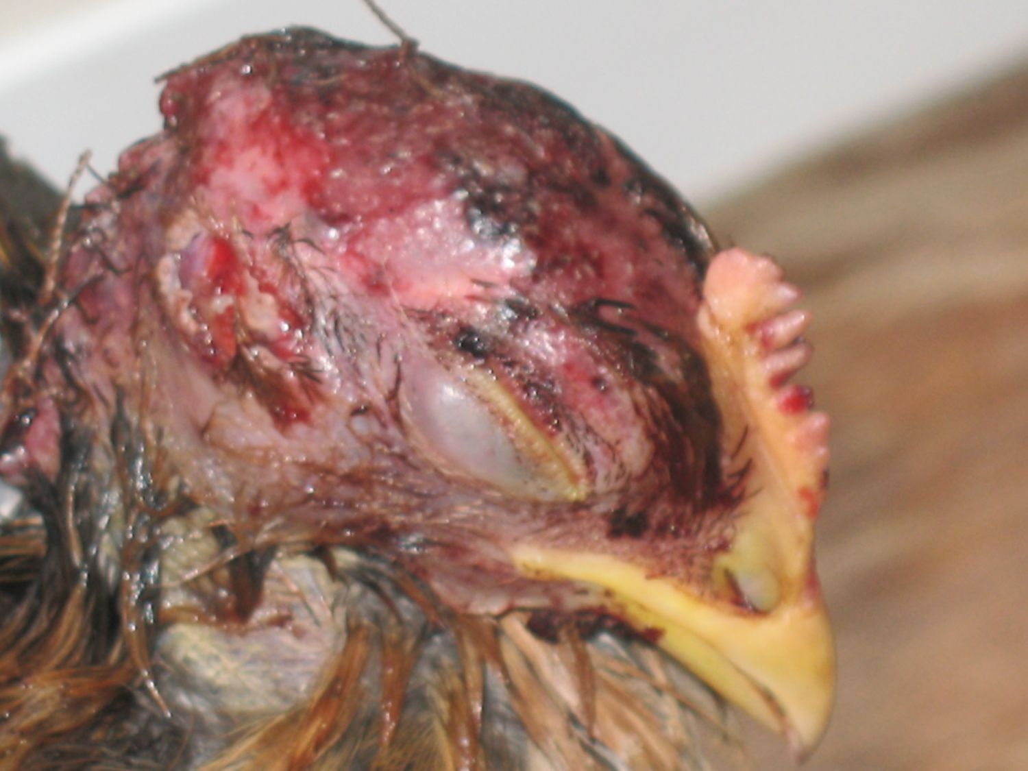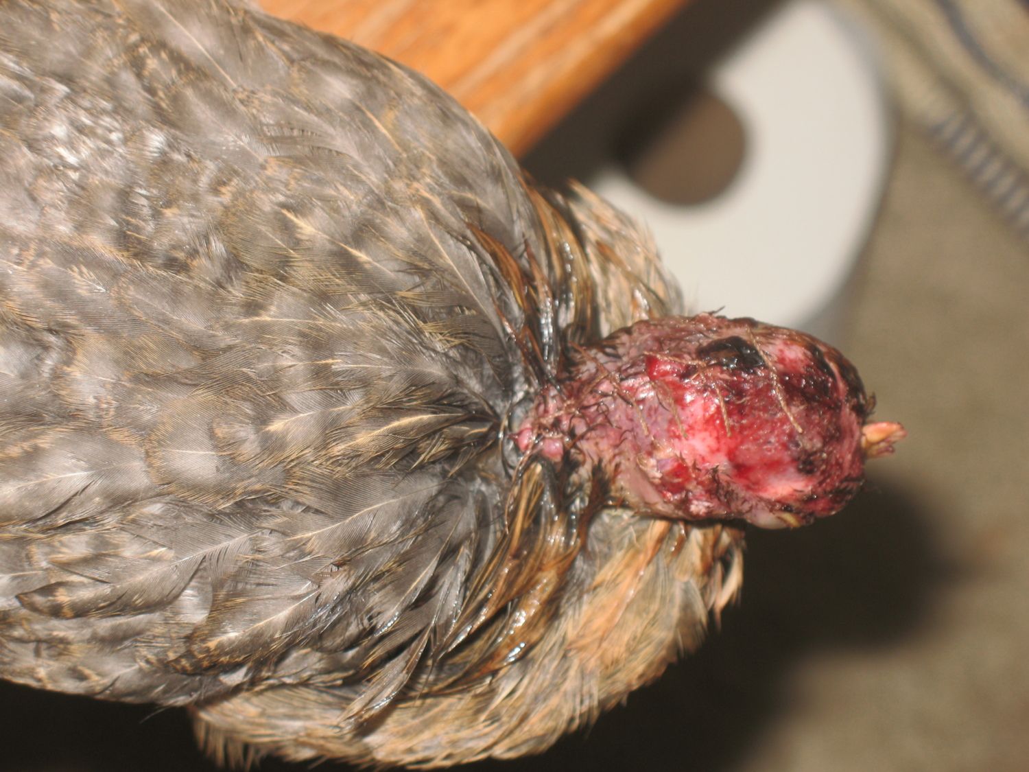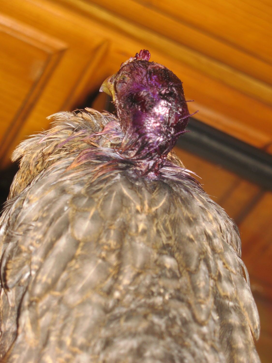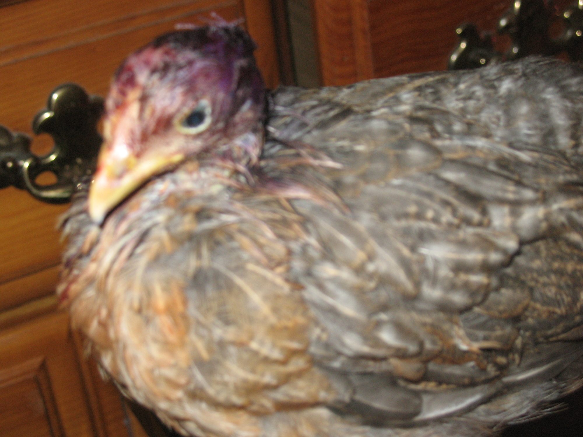Disaster struck today. Two of my welbar pullets managed to get into the turkey pen. I found the gap under the fence and fixed it but this is getting old. Both girls are ok at the moment. They must've been running from the turkeys and got themselves wedged between a tree and the chicken wire. The turkeys couldn't get them there but they were pinned and the rest of the chicken flock must've started picking at them. The one was lucky and only has the tip of her one wing chewed up. Not too bad either. THIS one though, I thought she was dead when I found her. She must've wiggled her head through the chicken wire, trying to get out, which made it a target. She was dripping blood all down her face when I found her and was limp, like she'd given up completely. I even saw her get pecked and she didn't even move. I didn't get a picture of her before I treated her but it was horrific. Her skin is completely ripped from the top of her head, the whole way down the back of her neck and the muscle was even missing a couple chunks. She was picked completely bald and the skin on the right side of her head was pulled forward towards her face, exposing her ear and part of her eye. I cleaned her up the best I could and made some makeshift stitches with a needle and heavy thread. It took 6 of them to pull the skin together down the back of her neck. Her left eye is still good and she'll open it and look around but she's sleeping a lot and not moving much. I know she can though because I took her outside to bluekote her head and an escaped turkey came over to see what was up. She went into a panic trying to escape. Her right eye concerns me. Though it doesn't look like there's any damage to the eye itself, The muscles to open and close her eyelid are most likely torn and ruined. Right now, her eyelid on that side looks stretched back a little since I had to pull her skin back some to connect it with the stitches. I'm using an eyedropper to slowly give her vitamin water. Everyone, please wish me luck with her recovery. She's going to need it.