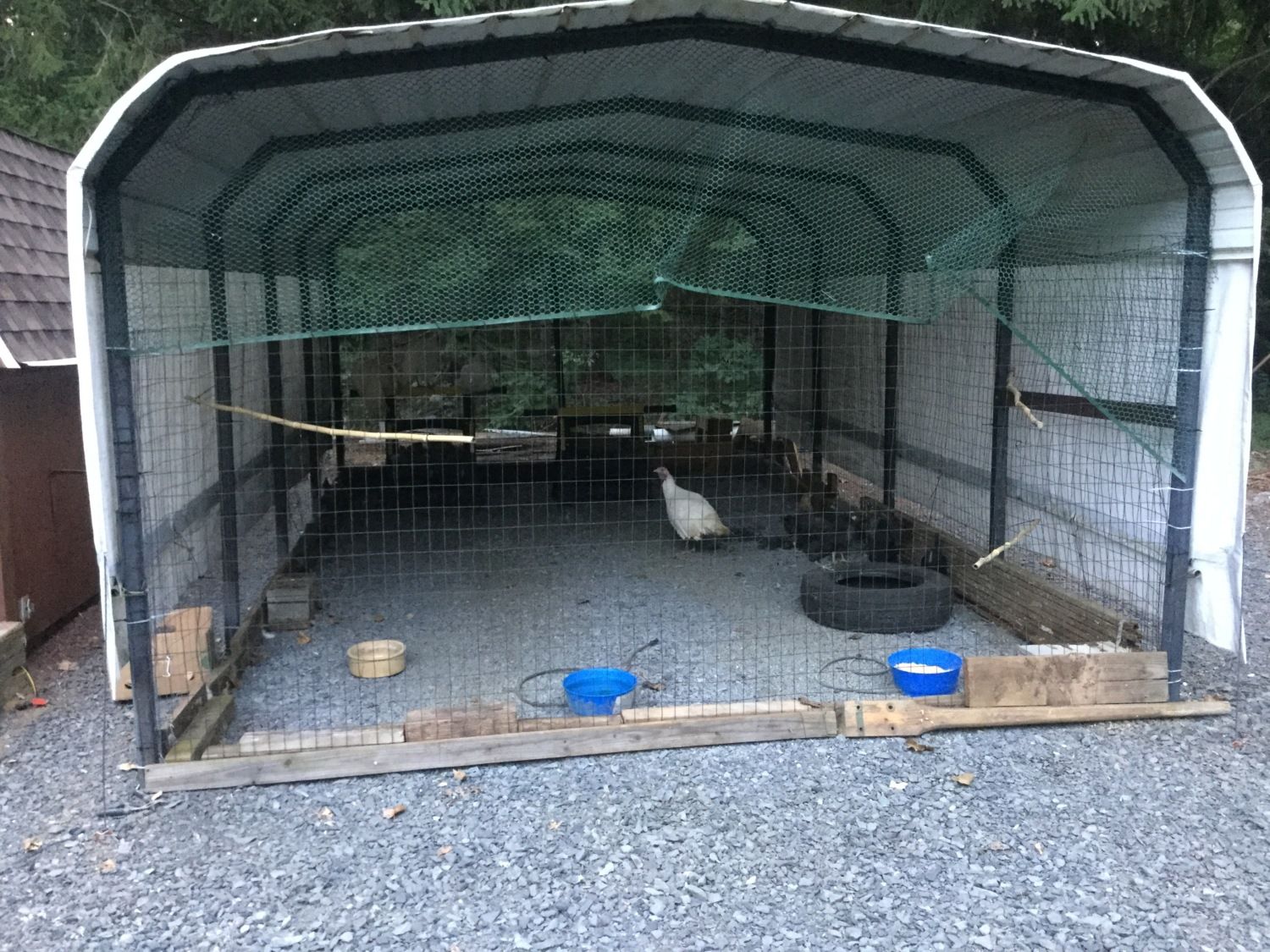 Here is my temporary setup for the turkeys and the older pullets. It doesn't look secure from the picture, but the wire mesh in the front is completely ziptied together so as no to allow anything to climb in between. The carport measures 12x20, so it's a decent size. Ideal for this lovely weather!