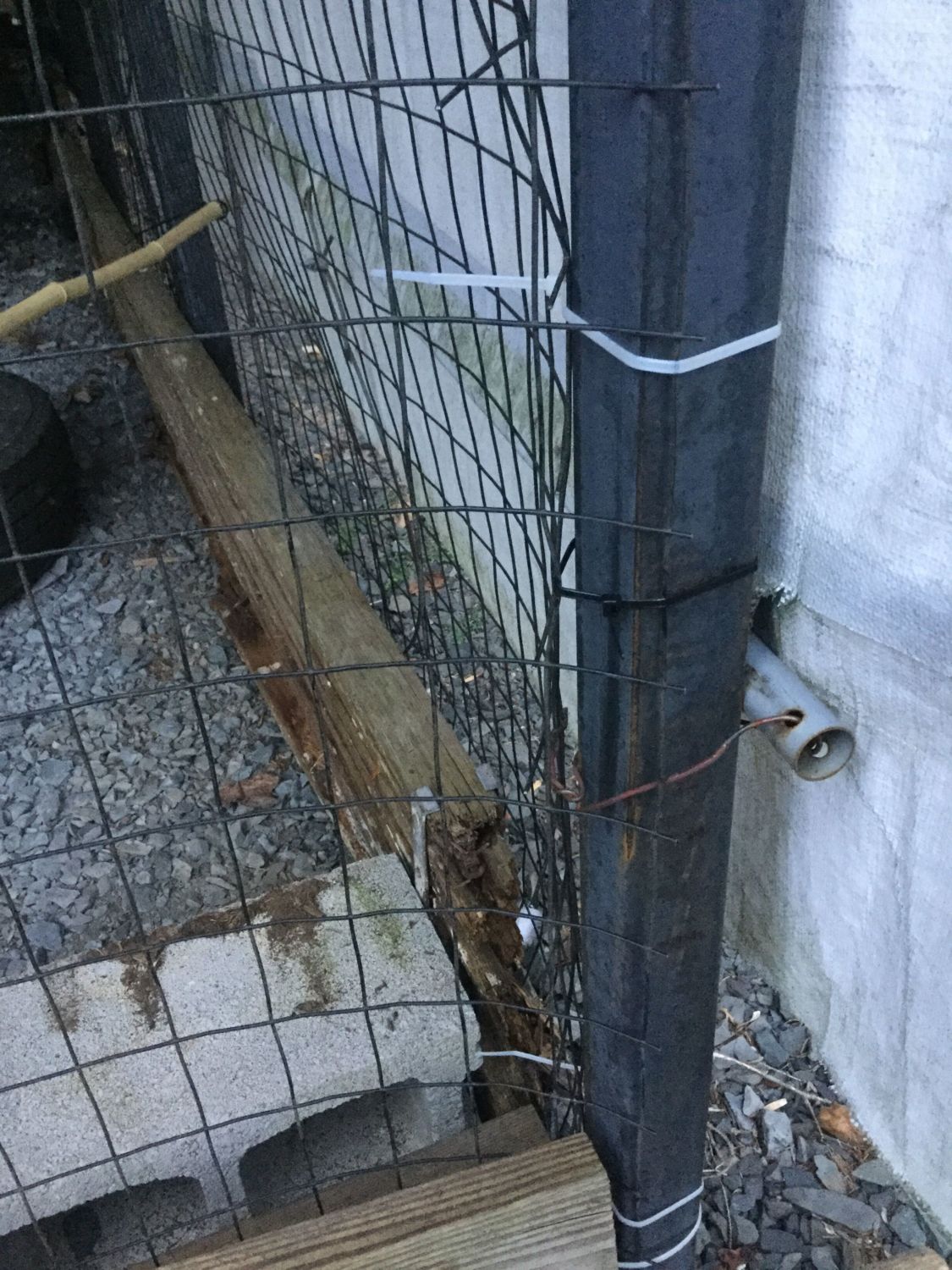 Showing how I lined the entire thing with wire, and ziptied it tight to the steel posts. Lots of lumber and cinder blocks around the edge to discourage digging.