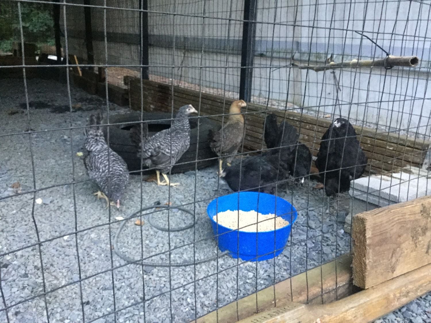 The young pullets that I got from Dheltzel. 3 Black sex links, 2 California Grays and 1 Wellbar. The pullets went in its the turkeys right before dark, and they all seem to be getting along fine. There is plenty of room, and high roosts for the chickens if they need to get away. I will post pics of the chicks later.