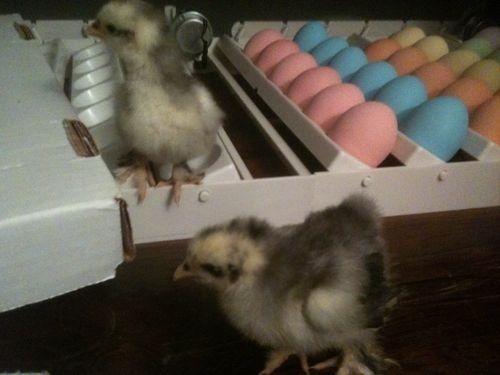 Cute chickies. Are those eggs REALLY that color? Wow.