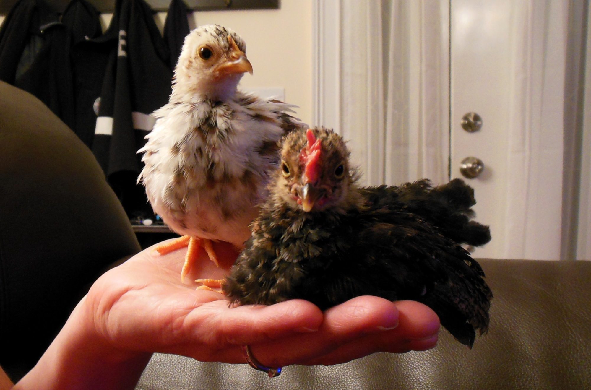 If my memory serves me right, she's about 10 or 11 weeks. She and the little Silkie I hatched are best buddies. I can't pick one up without the other getting upset. Haha.