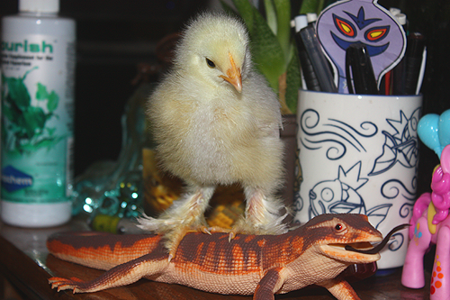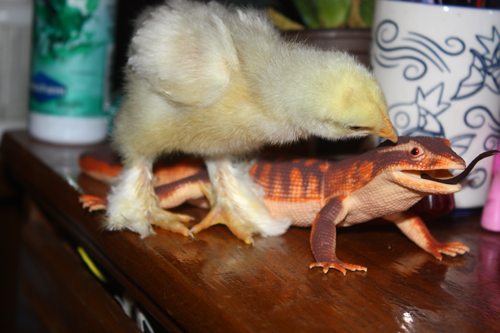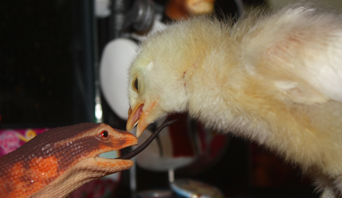 Just precious! Is Dottie's feathers black on the ends or is that a black baby chick that dove into her wing and went splat?