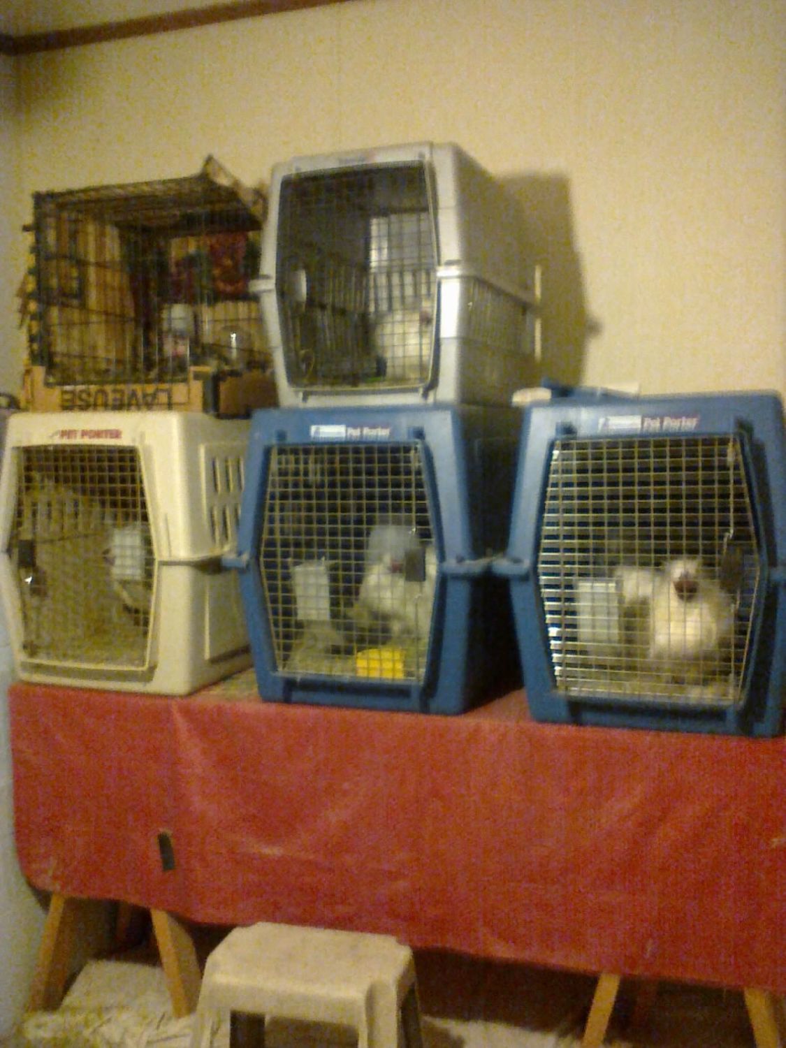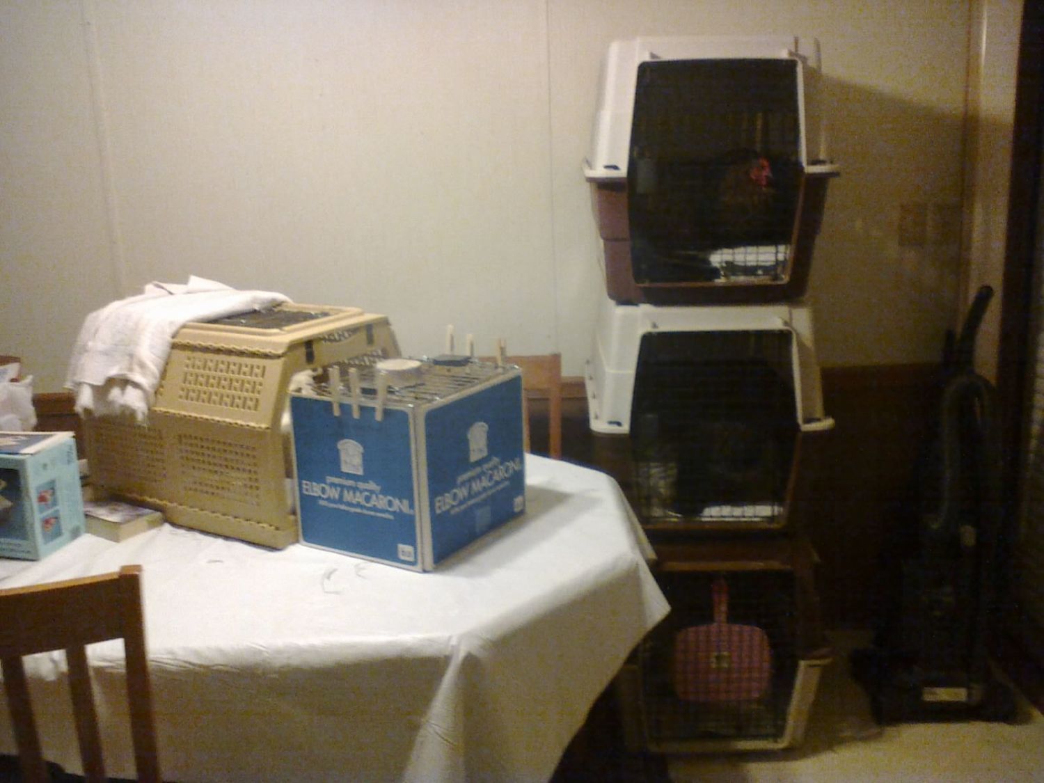 This is where the girls stayed! In the corner of the dining room. Marias cage is the one on the table. I took the gate off so I could butt a grass filled box up to it. I used the gate for the top of the box. I have mirrors in the boys and girls crates. They love talking to themselves.