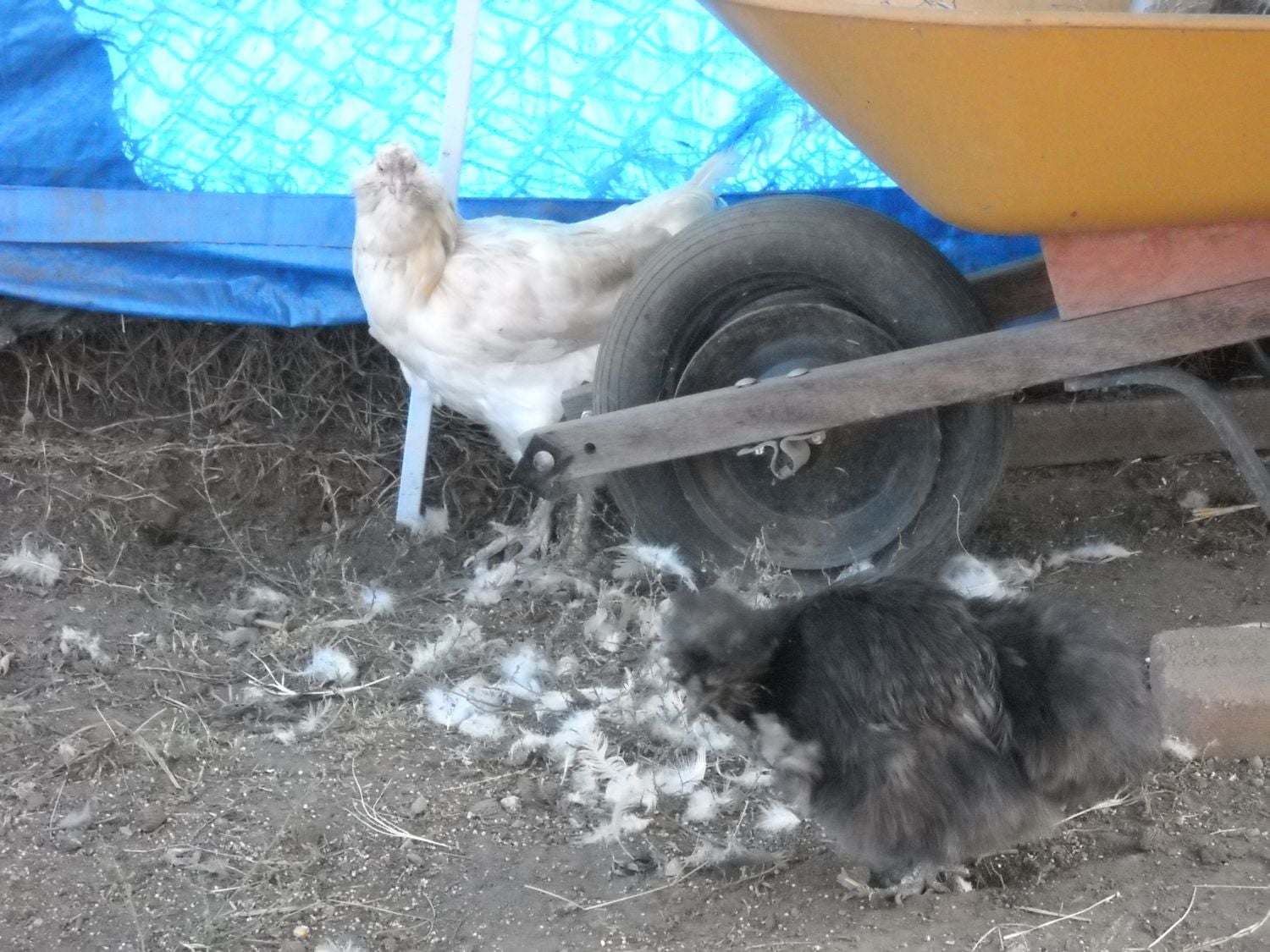 Our Blue Wheaten Ameraucana molted in increments - molted, stopped, molted again, stopped. Here is one afternoon's lesser feather molt. She hid behind the wheel and wanted to be reclusive when she molted.