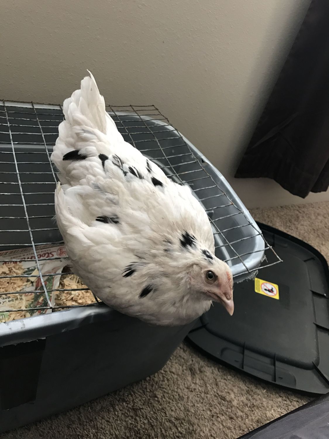 Her name is ruby! And she cuddles. She's weird corky and goofy. It's -31 outside so when I got her she was too young to be with the girls so she will be inside probably till spring! So she's my room mate. At night she will hang in this tote till like 6 then start freaking out. So I put her on the edge of the tote to perch and bring her next to my bed cause she can't handle not being in pecking distance lol. She's a doll